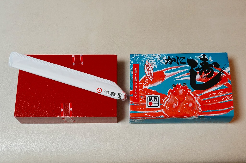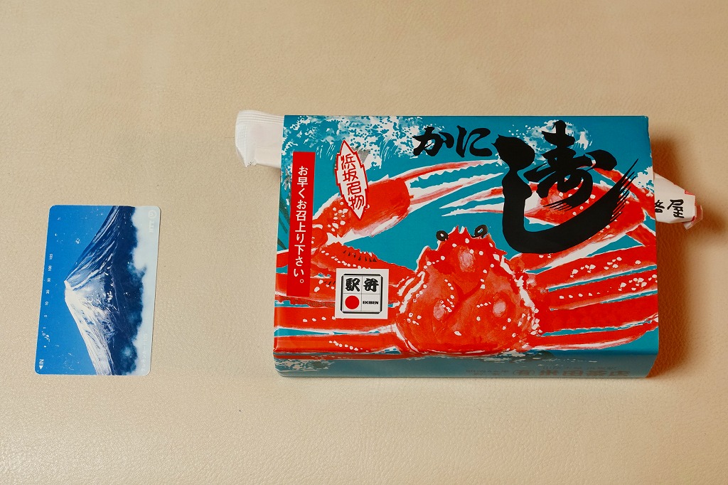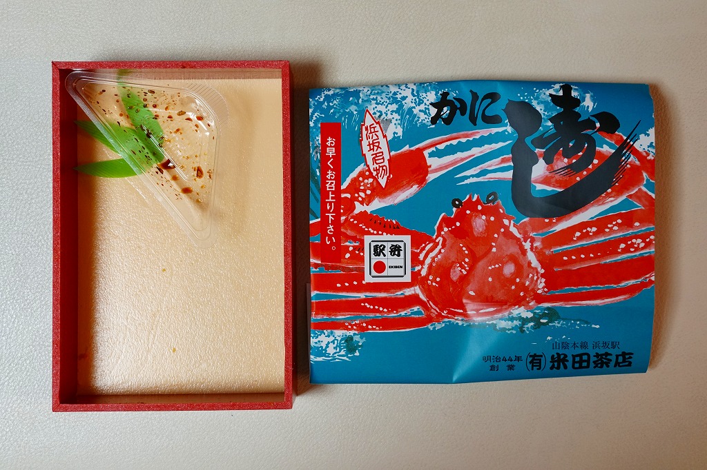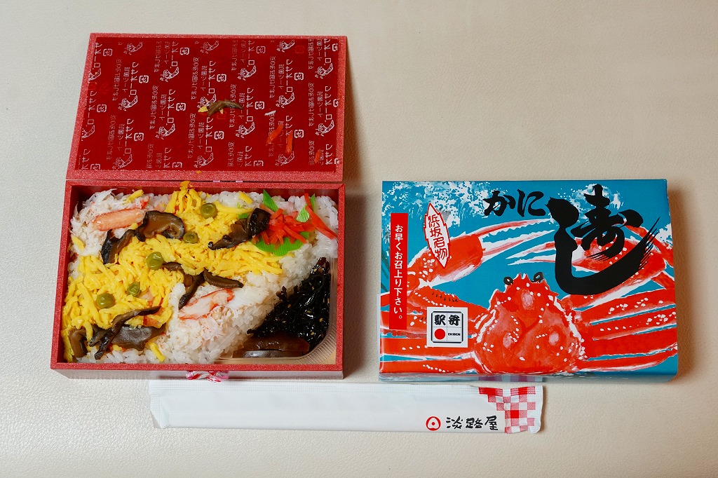 2019(平成31)年4月10日の発売。昭和時代から兵庫県の山陰本線浜坂駅で駅弁として売られ、調製元の駅弁撤退後も駅前商店で売られ、この年の1月で廃業により終売となった名物駅弁を、神戸の駅弁屋が継承し復刻した。掛紙の絵柄は浜坂駅弁を踏襲、酢飯をカニの酢漬けのほぐし身や錦糸卵やシイタケやグリーンピースで覆い、紅生姜と昆布佃煮と奈良漬を添える中身も、やはり浜坂駅弁を踏襲した。容器は踏襲されなかったほか、風味も現地の当時とはなんとなく異なるような気はした。価格は2019年の発売時や購入時で1,100円、2022年3月から1,150円、2023年時点で1,200円。