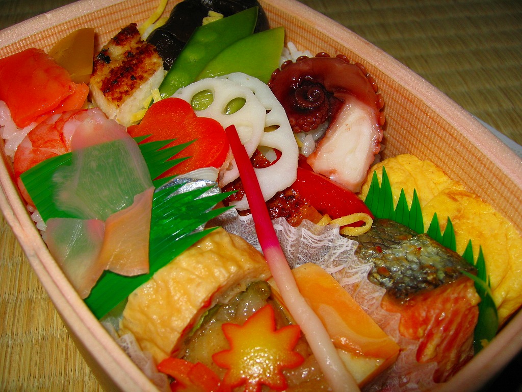 2007(平成19)年1月12日に発売か。樽の断面型な容器は、装飾付きのふたが枠にきれいにはまり、これに駅弁の名前を書いた掛紙を巻いてテープで留める。中身は酢飯をほどほどに詰め、その上と横に玉子焼、鮭みそ漬、タコ旨煮、はじかみ生姜、煮穴子、椎茸など19種類もの具を添えるもの。