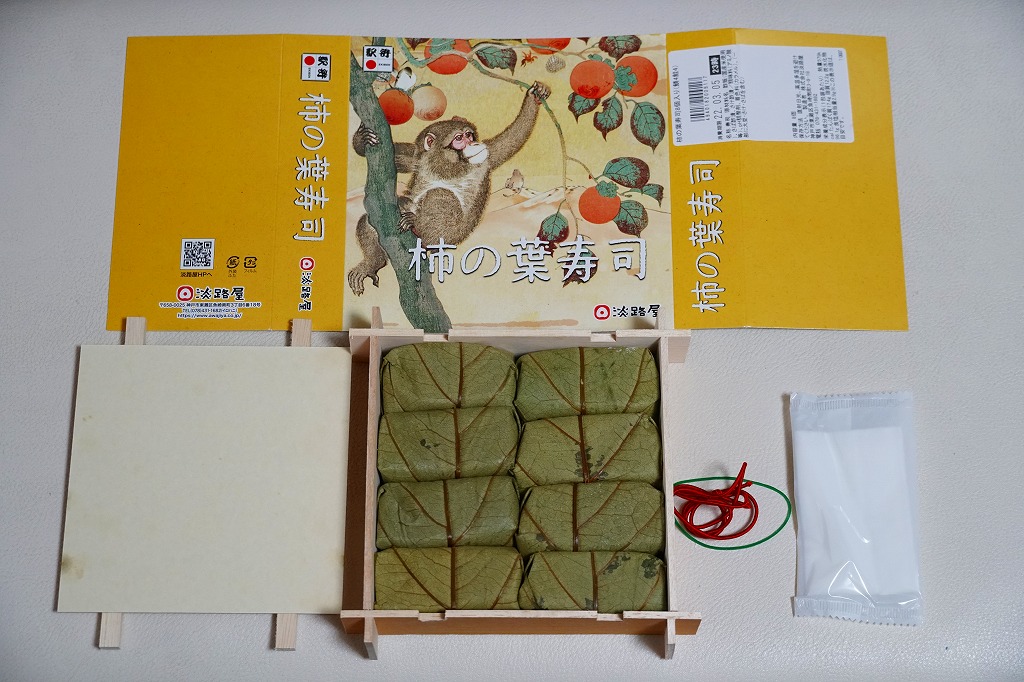 この姿と名前では、2021(令和3)年の11月に発売。小さな酢飯にさけを貼り、柿の葉で包んだものを4個、同じくさばのものを4個、箱詰めしてスリーブに収める、ごく普通の柿の葉寿司。味もつくりも見た目も、落ち着きのある感じ。「柿の木と猿」と題された、ふたのイラストが印象的。