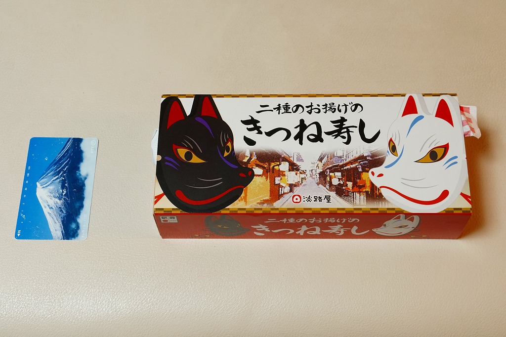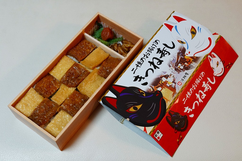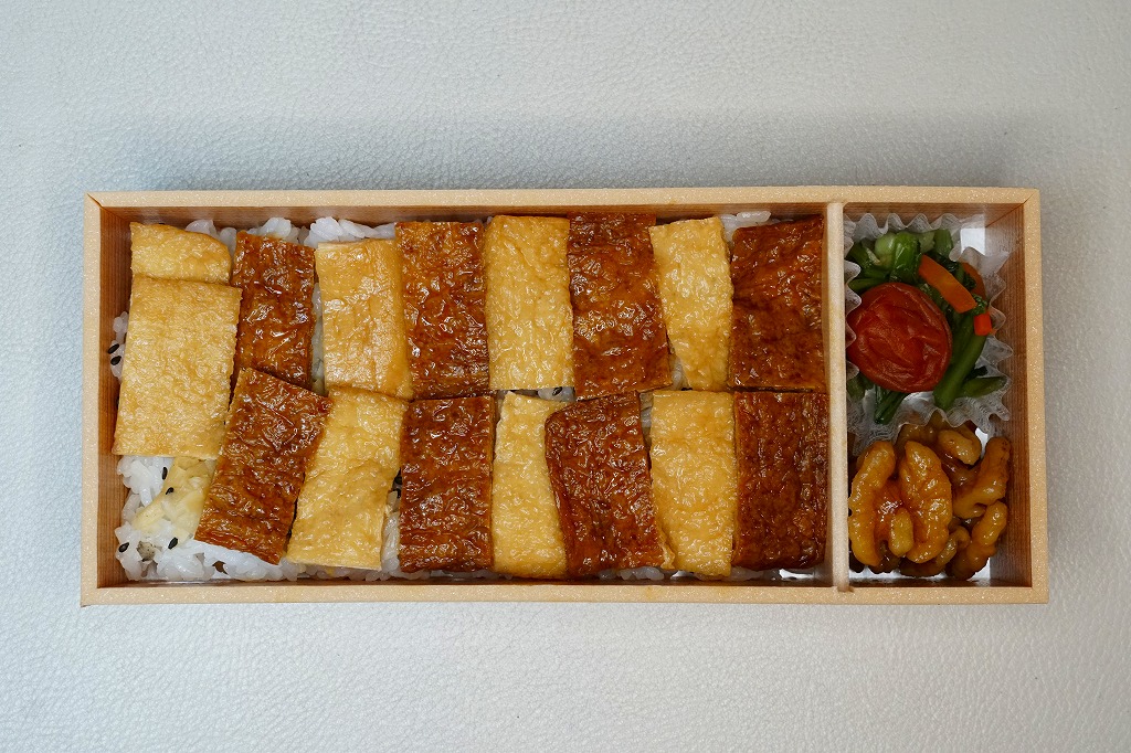 2019(令和元)年7月27日の発売。長方形の容器に詰めたゴマ御飯を、四角く刻んだ濃淡の油揚げで市松模様に覆い、クルミ、小松菜、梅干しを添付。これはなかなかのアイデア商品。おかずのない弁当なのに、稲荷寿司のようにそのまま食べられる。