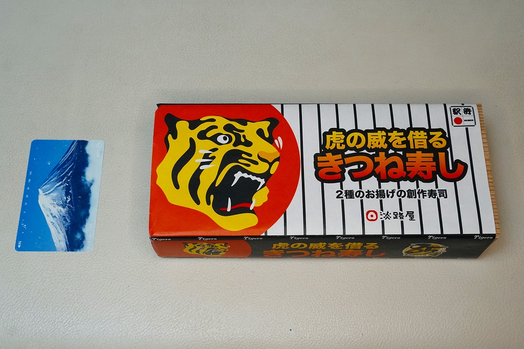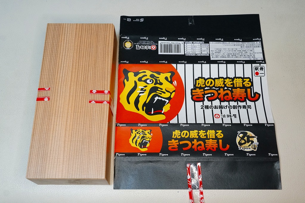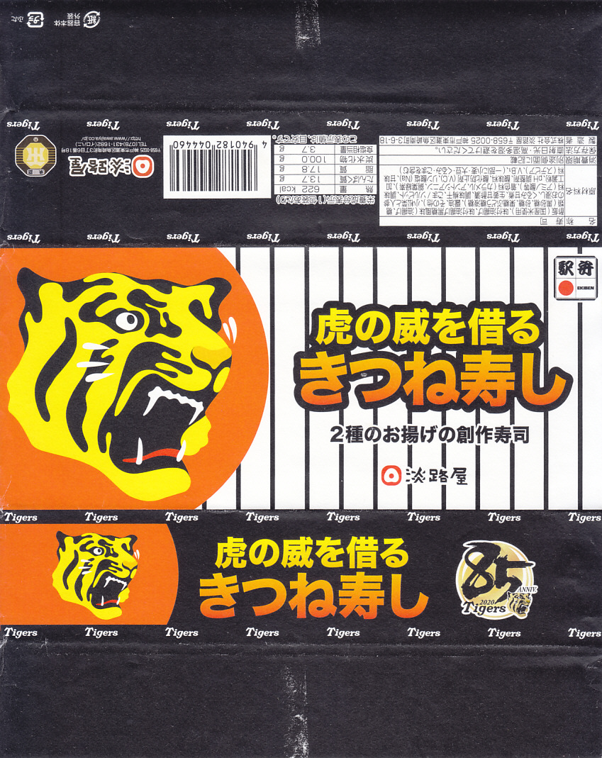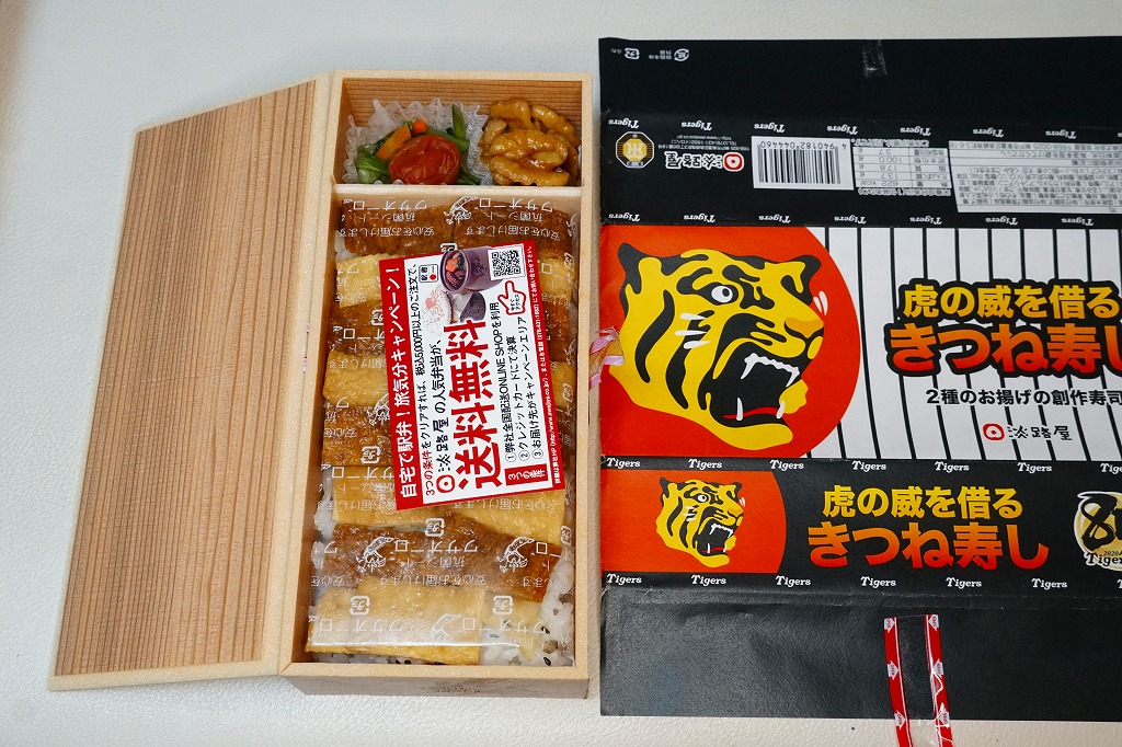 中身は「二種のお揚げのきつね寿し」と同じで、長方形の容器に詰めたゴマ御飯を、四角く刻んだ濃淡の油揚げで覆い、クルミ、小松菜、梅干しを添付するもの。飯の覆い方を、市松模様からタイガースのユニフォームにある縦縞模様にして、球団を応援した。掛紙にもちゃんと、黒と白の縦縞模様がある。8月または7月で売り止めてしまったように見える。