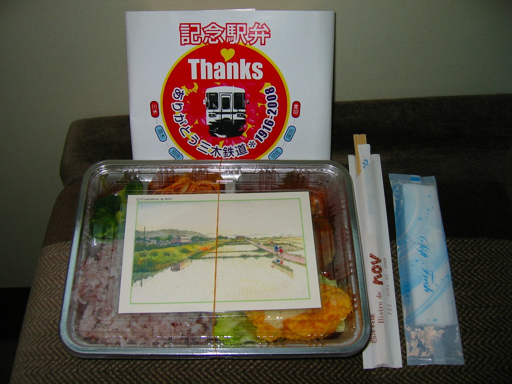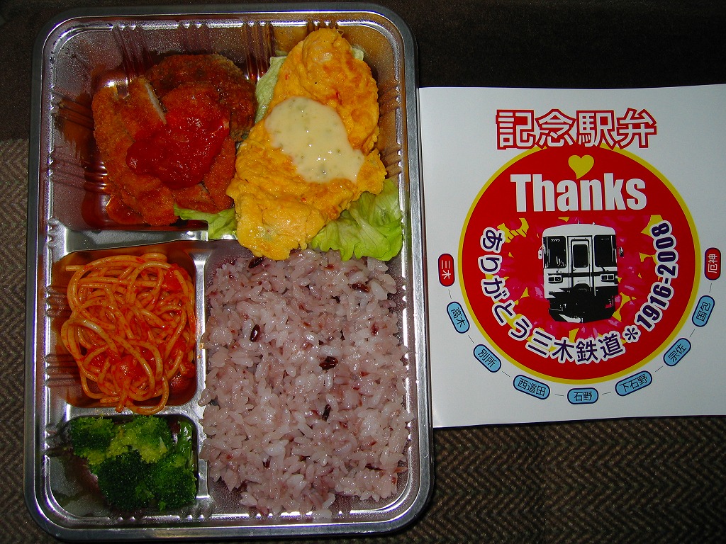 三木鉄道の全線廃止に伴う記念イベントの一環として、2008(平成20)年3月の土休日に駅前で販売された、三木駅史上最初で最後の駅弁。市内各店を調製元とする、価格と掛紙を揃えた弁当類が、訪問時で7種類販売されていた。