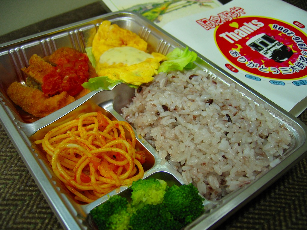 昔懐かしい銀色のプラ製の惣菜容器に共通掛紙を巻く。中身は古代米の御飯に海老入りオムレツ、ハンバーグ、スパゲティ、ブロッコリー、トンカツなどを詰める、容器に似合う洋食仕出し弁当。この内容で千円も取るためか、おかずの品質は高そうで、三木鉄道を描いた絵葉書も付けられた。調製元は上記サンドイッチと同じ西洋料理屋さん。