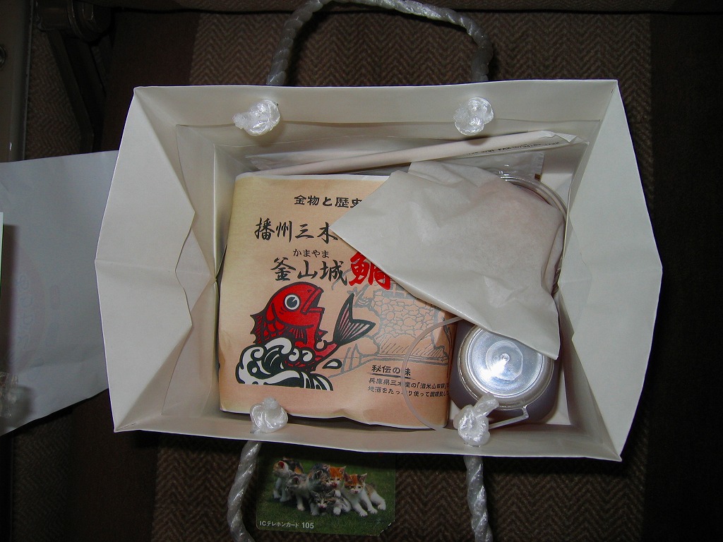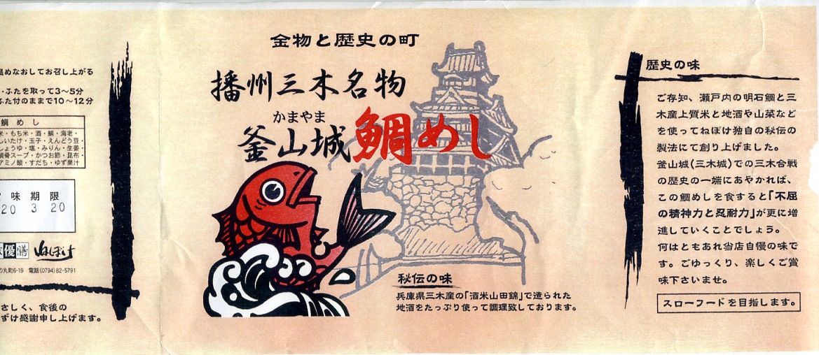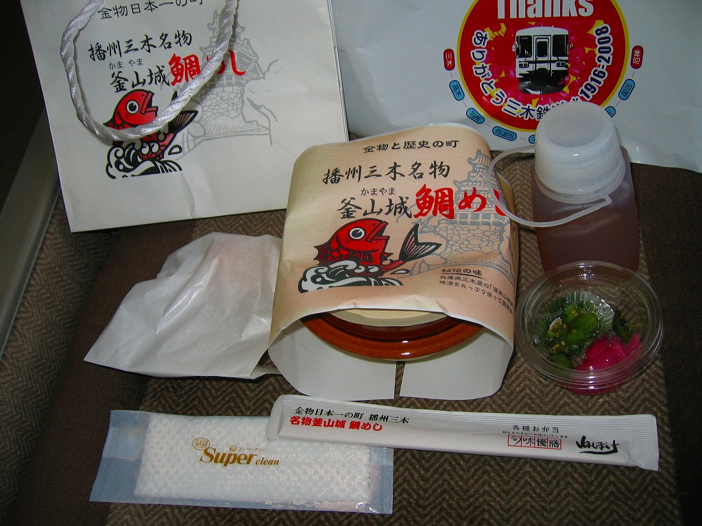 ふたも陶製の釜飯容器を、鯛と城を描いた掛紙で包み、付合せとポリ容器茶と白い紙袋とともに同柄の専用紙袋に詰め、共通掛紙でふたをする。中身は柔らか白御飯の上に有頭海老と鯛の焼き物、里芋と椎茸、錦糸卵とグリーンピースを載せるもの。中身も風味も体裁も、そのまま駅弁として販売されて不思議のないもの。調製元は地元の和食レストランで、これと同じ商品がもともと発売されているそうな。