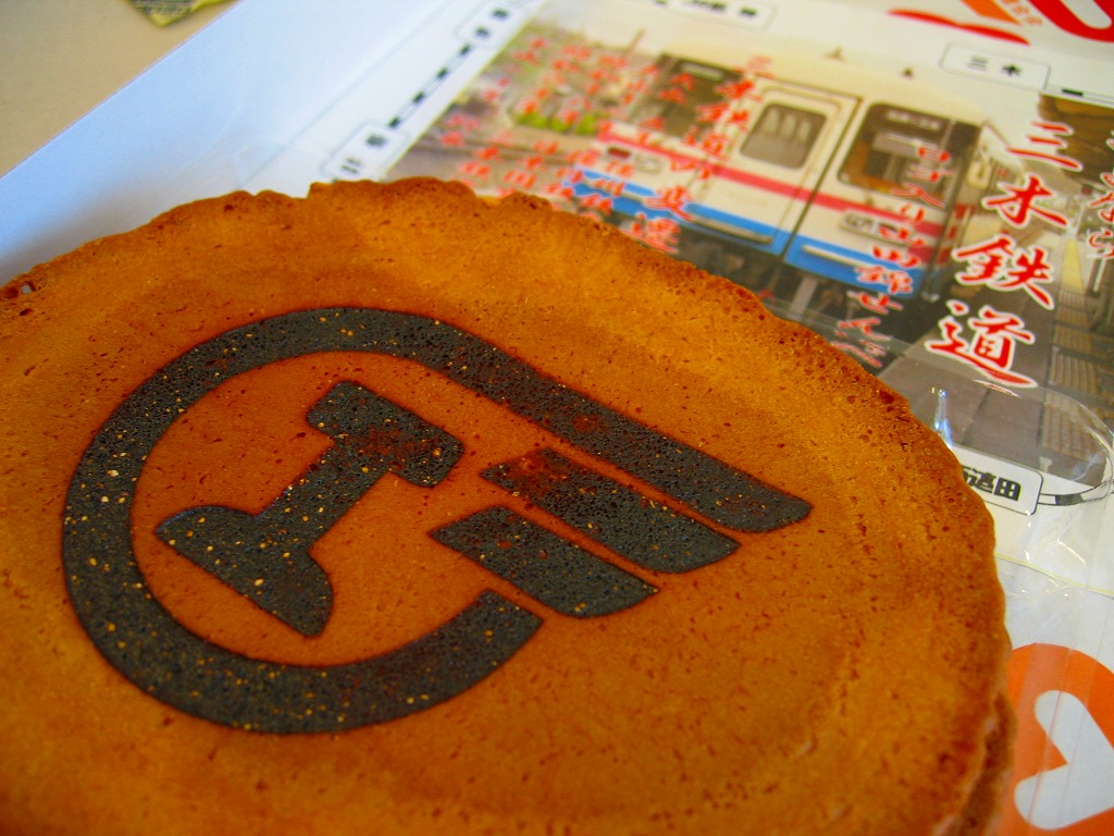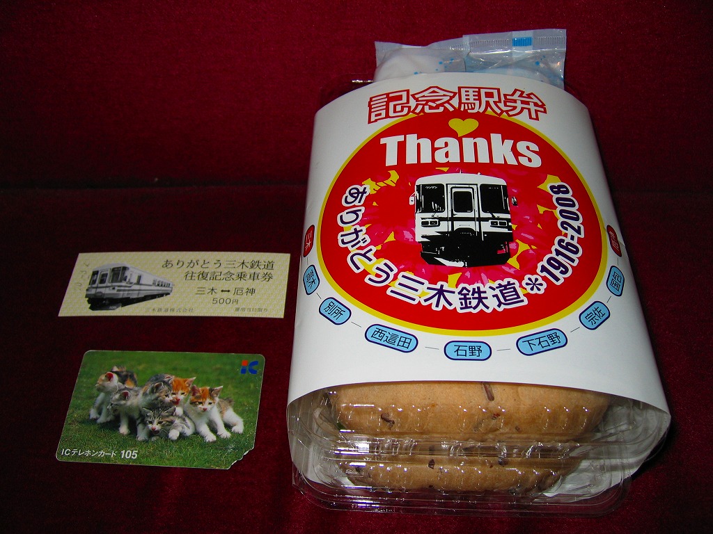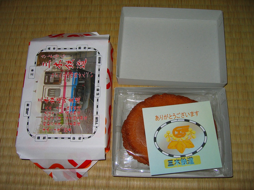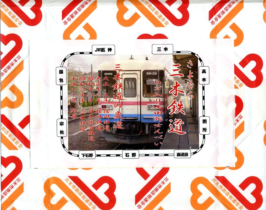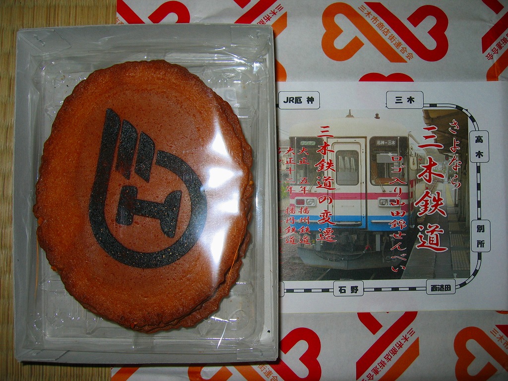 2007(平成19)年6月9日に三木駅で発売。小麦粉に黒豆や酒米「山田錦」を混ぜて焼き、三木鉄道の社章の焼き印を入れた、直径十数センチの薄いせんべいを5枚、透明なプラ製トレーに重ねて、透明なビニール袋に入れ、ボール紙の箱に詰め、三木市商店街連合会の包装紙で包み、駅撮りの車両写真や路線図を印刷した掛紙をセロテープで貼る。食べてもうまい記念品。