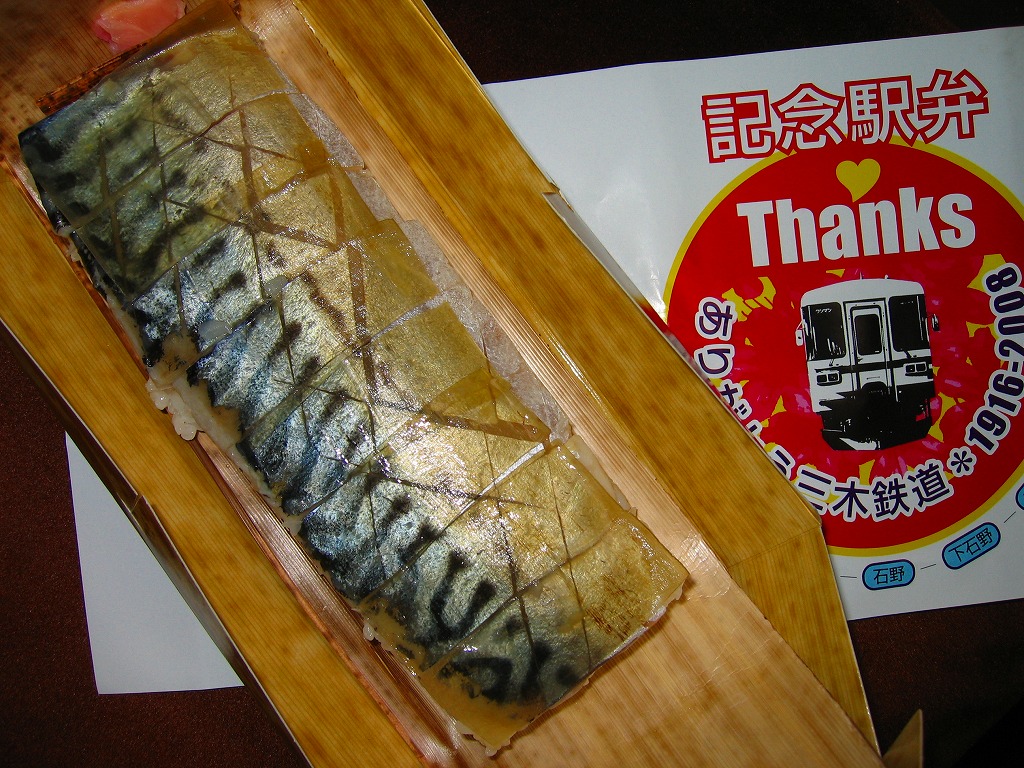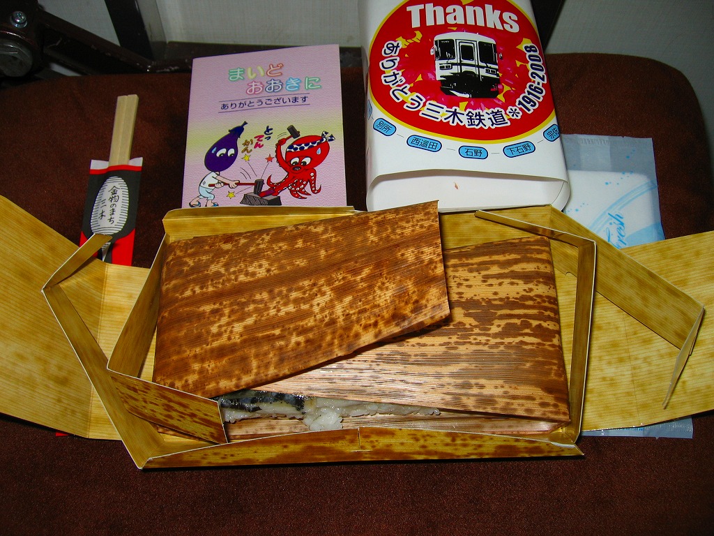 竹皮柄のボール紙製容器に割りばし、おしぼり、しおりを置いて輪ゴムで留め、共通掛紙を巻いてセロハンテープで留める。竹皮に包まれた中身は、昆布をかけた鯖の棒寿司が1本。同じような駅弁は各地にあるが、これはサバの身が少々薄いものの、脂の乗りは抜群だった。調製元は三木駅の市街からは少々の距離がある寿司屋。