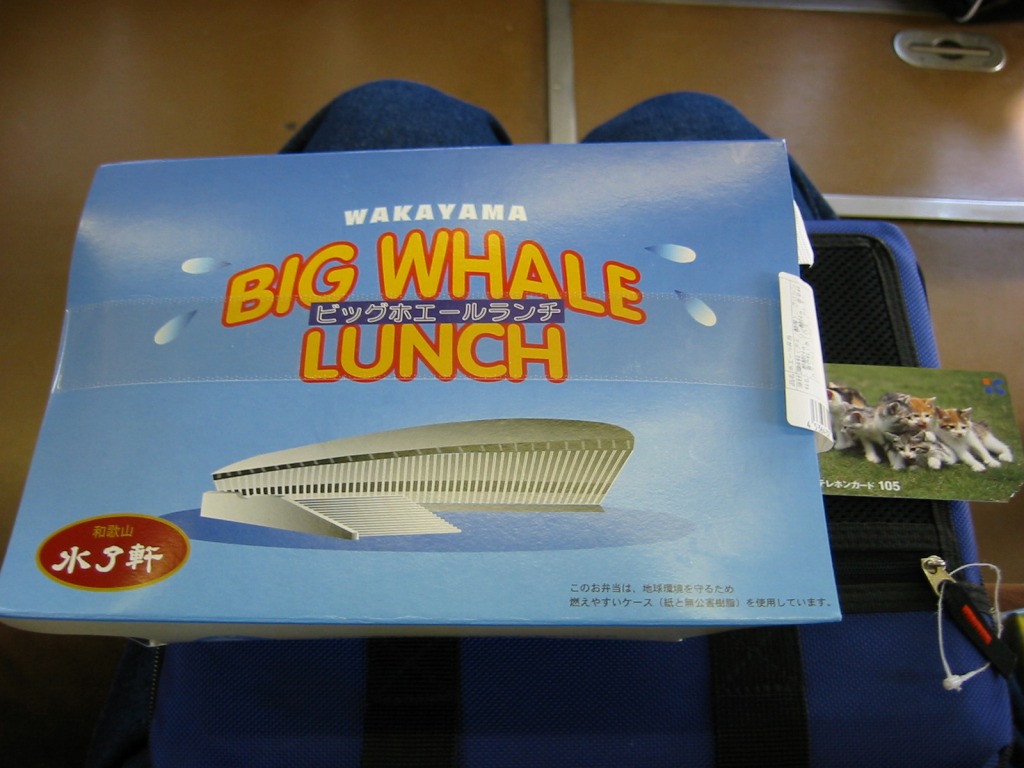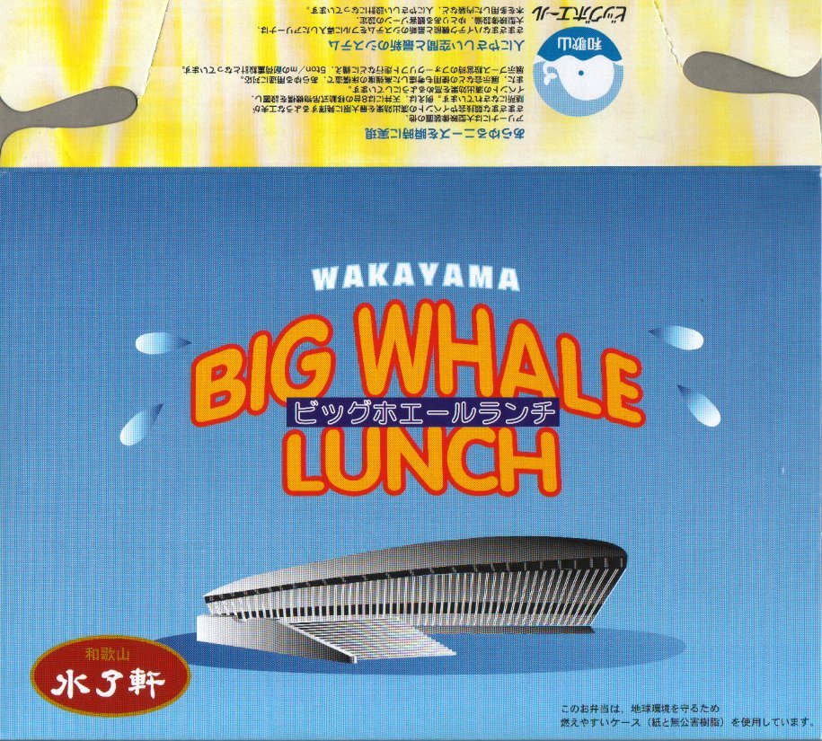ビッグホエールとは、鉄道貨物ターミナルであった国鉄和歌山操駅の跡地に和歌山県が建設し、1997年7月にオープンした、8,500人を収容できる鯨型の多目的ホール。貯留雨水による噴水で「くじらの潮吹き」を再現するシステムを持ち、写真では感じ辛いが実物を見るとなかなかクジラに似ており、この駅弁の容器はその建物に本当に似ている。白浜方面行列車に乗れば、和歌山駅を出た数分後に右側の車窓から見えるはず。