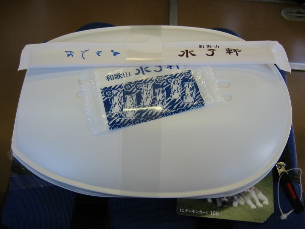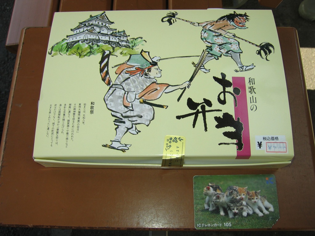 和歌山駅の阪和第一食堂版の並等幕の内駅弁。和歌山の城や祭を描いたボール紙の箱を使用、白いトレーに入った中身は、白御飯に鳥フライとエビフライ、椎茸や人参などの煮物、カマボコと玉子焼、牛肉にソーセージに酢の物など。見栄えも内容も風味も、寒々とした古き幕の内駅弁だが、白御飯の形状が俵2個に阪神競馬場型が1個となっており、なぜこんな形にしたのか聞いてみたい気がした。
