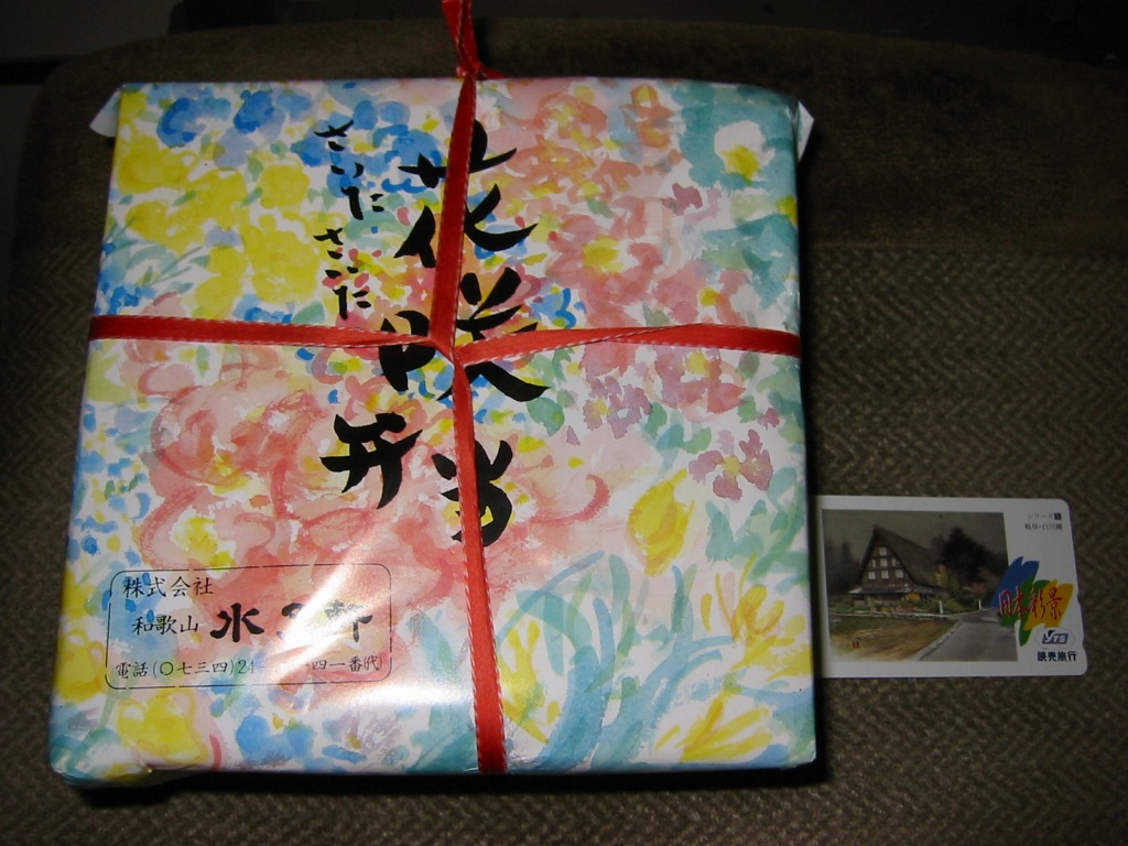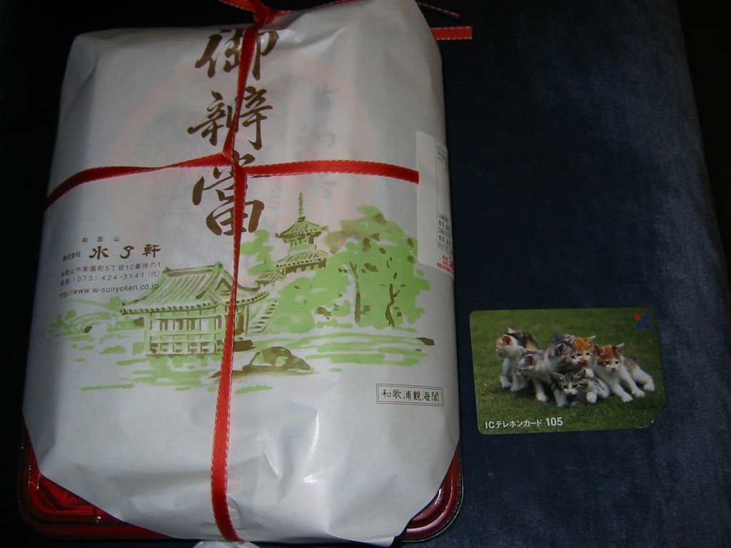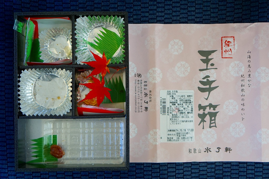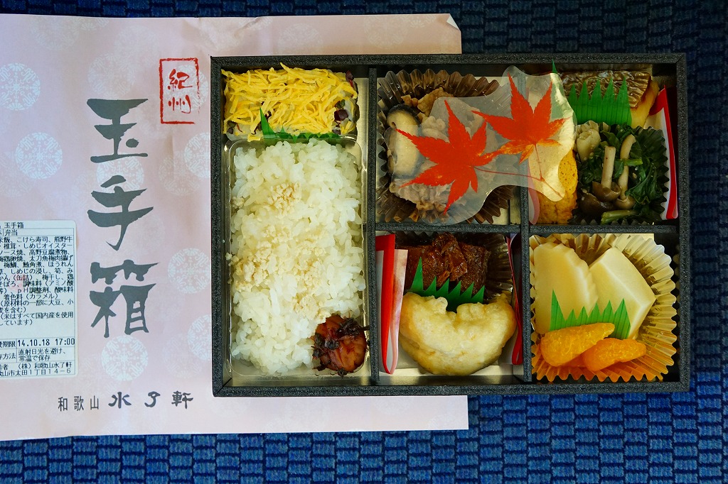 2011(平成23)年までに1,200円で発売か。大きく見える長方形の容器に、白飯とこけら寿司、梅鶏卵焼と太刀魚梅肉揚、牛肉煮とシイタケ、マグロ角煮としめじのおひたし、高野豆腐とみかんなど。「紀州和歌山の味わい」であってもなくても、高級な折詰だと思う。後にこれが「紀州玉手箱 ぎん」(1,500円)となり、他に「紀州玉手箱 きん」(2,000円)が出た模様。