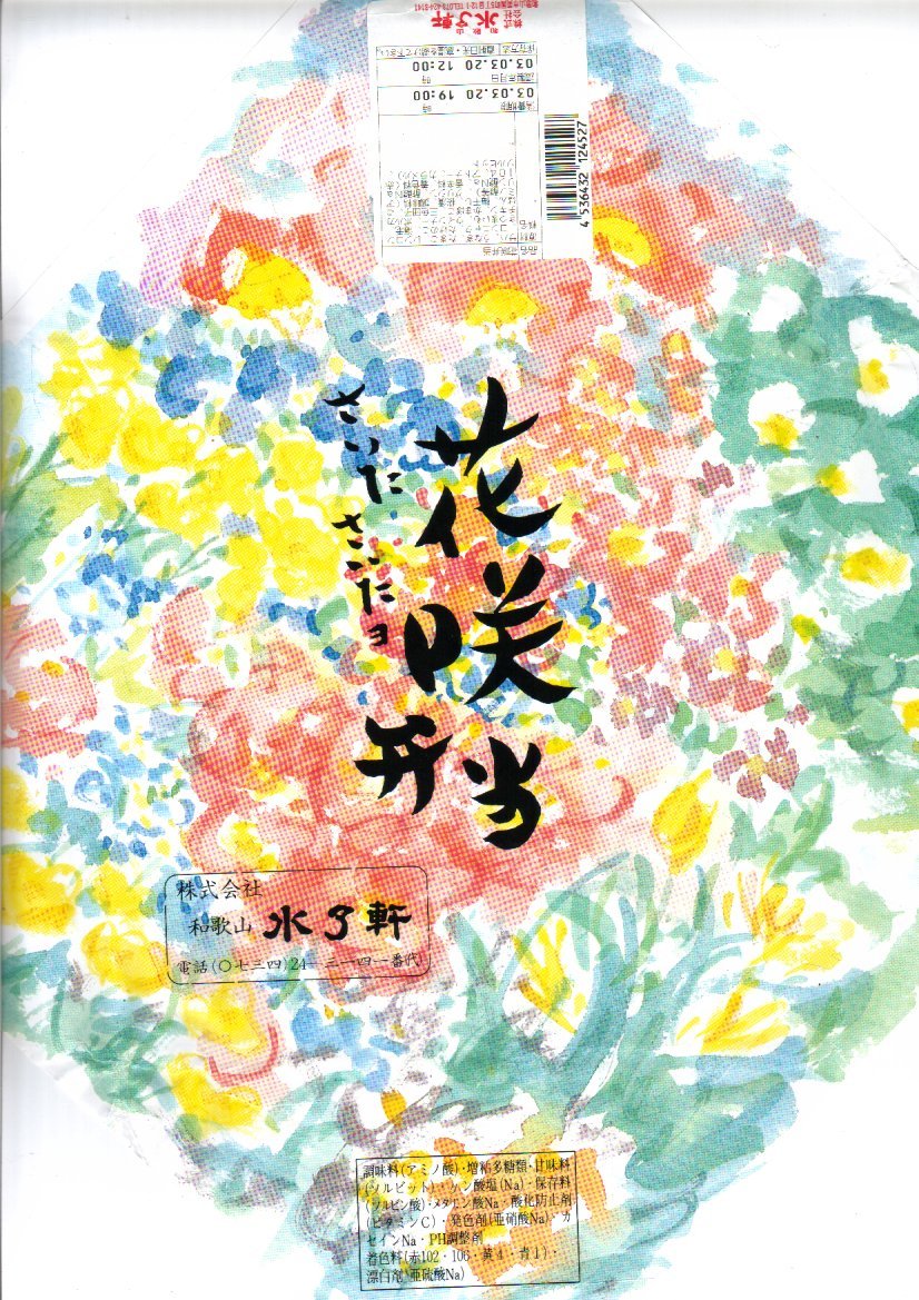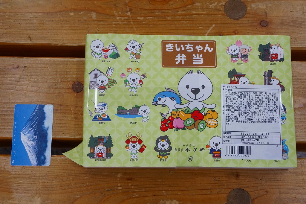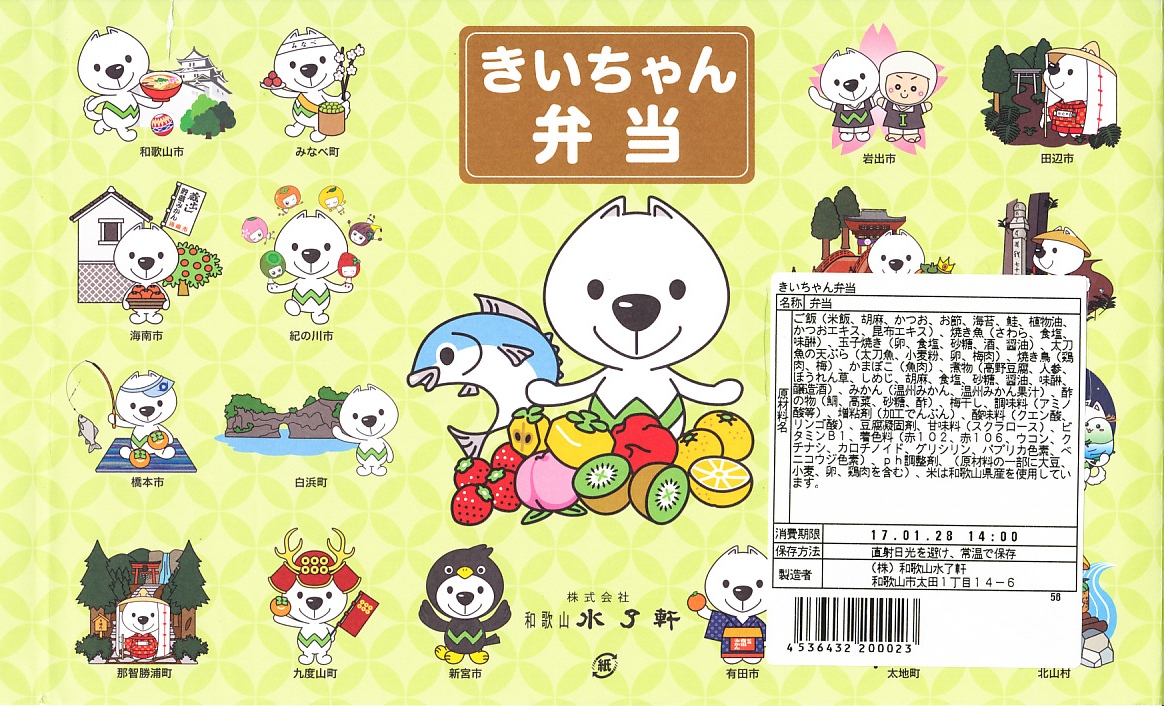 和歌山県での第70回国民体育大会「2015紀の国わかやま国体」の開催に向けて、2015(平成27)年5月に発売。「きいちゃん」とは、その国体のマスコットキャラクターであり、紀州犬をモチーフに「紀の国」「紀伊国」と「紀州犬」の頭文字「き」をとって親しみやすく「きいちゃん」と名付けたという。掛紙にはきいちゃんが和歌山県内のうち18市町村分掲載されるが、その一部が大きな食品表示ラベルに隠れてしまった。