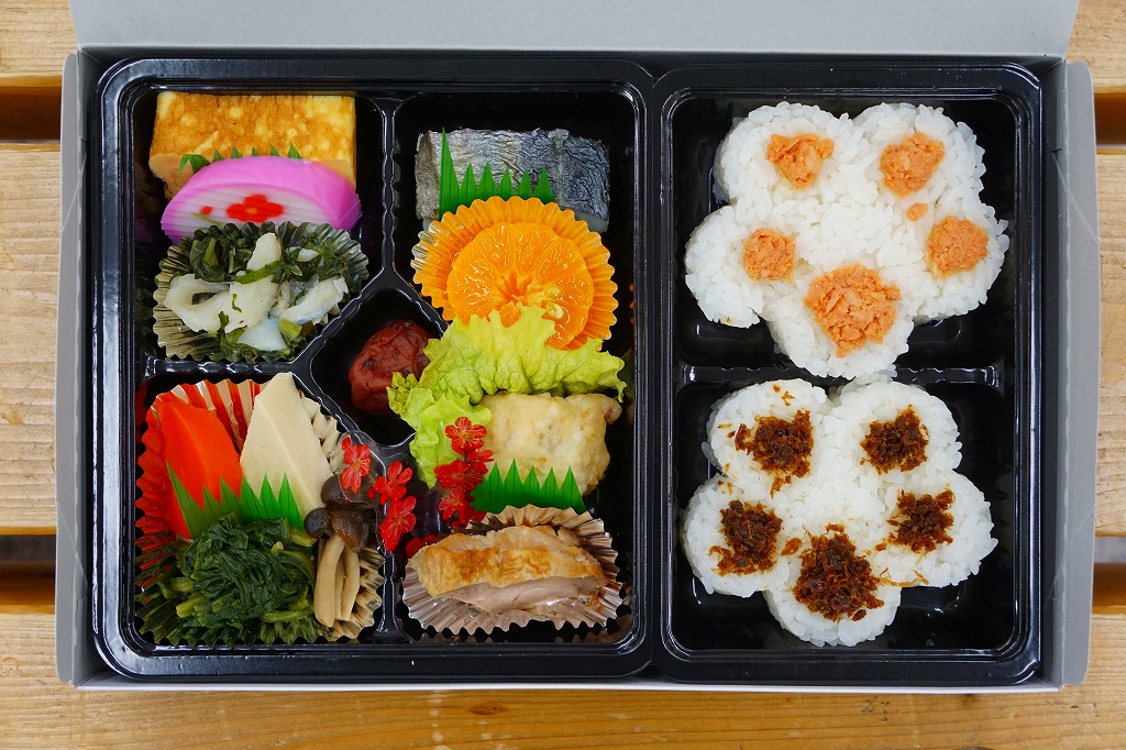 駅弁の名前や外観から判断して、春限定の駅弁か。花一杯の掛紙に包まれた正方形二重の経木折の中に、下段では桜型と扇形と松型の御飯に桜色のカップで梅干を添え、縦横に仕切られた上段には蓮根等の煮物、エビや薩摩芋等の揚げ物、玉子焼に焼き魚、ハムに蒲鉾に団子が入る。
