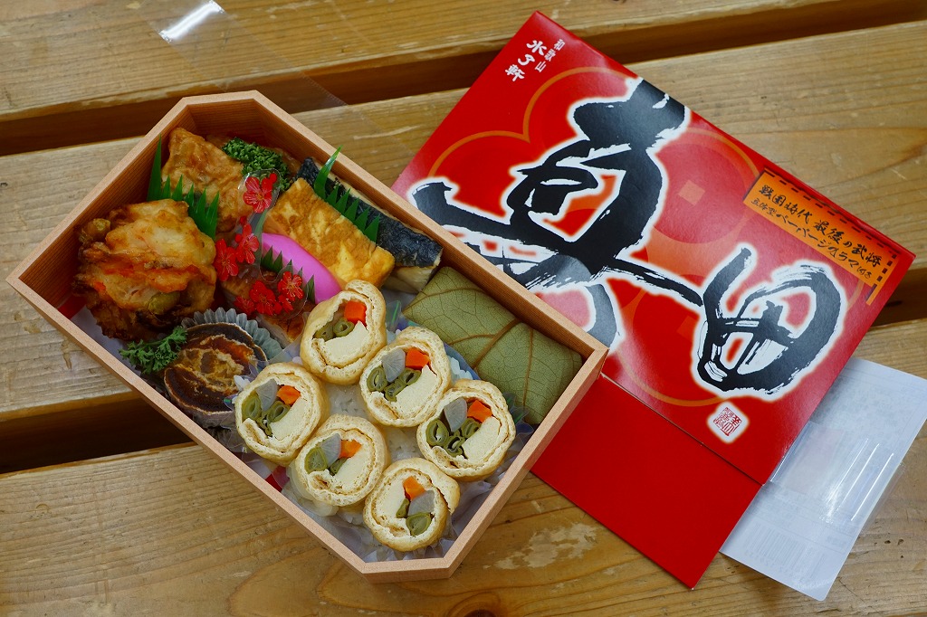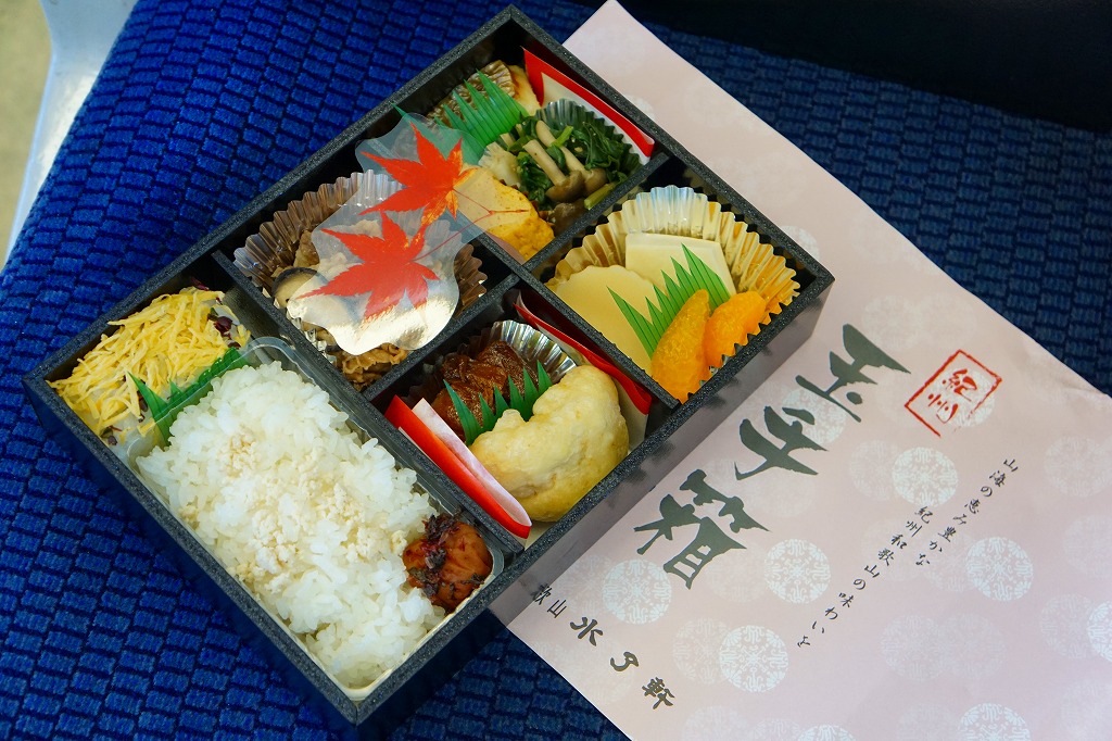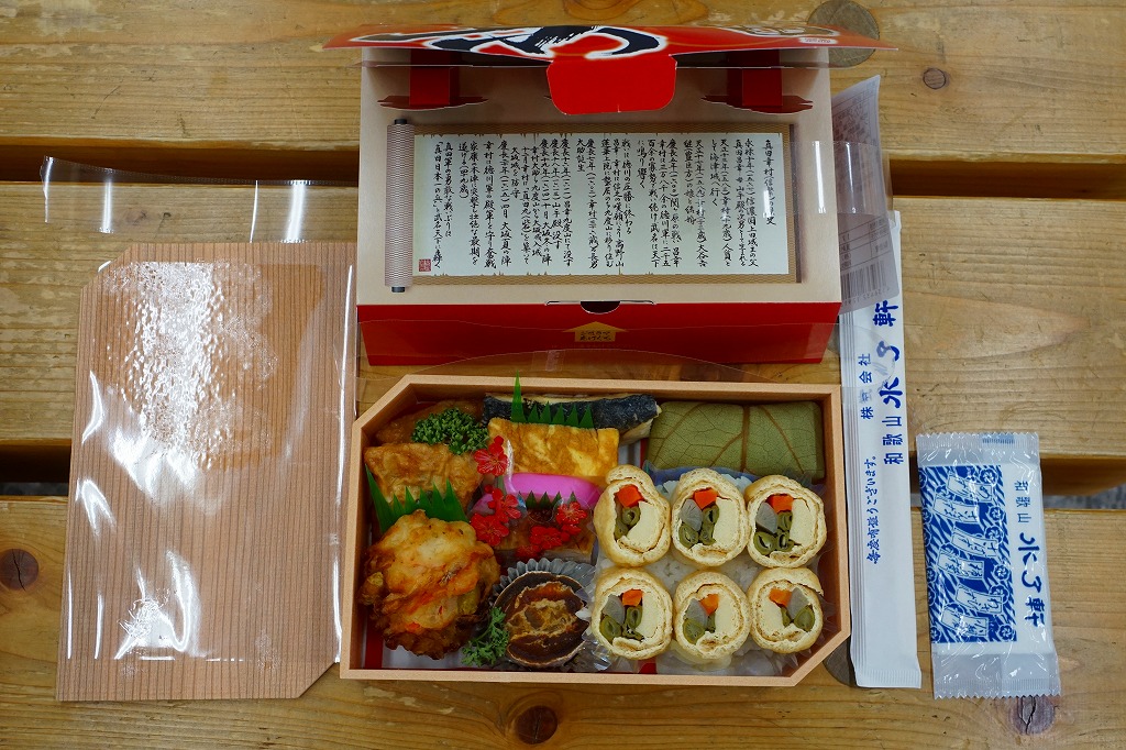 和歌山駅の実用的な幕の内弁当。安っぽいビニール容器を使用するが、掛紙は徳川の葵の家紋をバックに和歌浦・観海閣を描き旧字体で御弁当と記す古風なもの。中身は形の悪い胡麻振り俵飯に玉子焼や蒲鉾や鶏照焼に煮物揚げ物が少し入り、コンビニ弁当並みの値段で分量とまずまずの味が確保されている。秀逸な掛紙とのミスマッチも楽しめるか。現存しない模様。