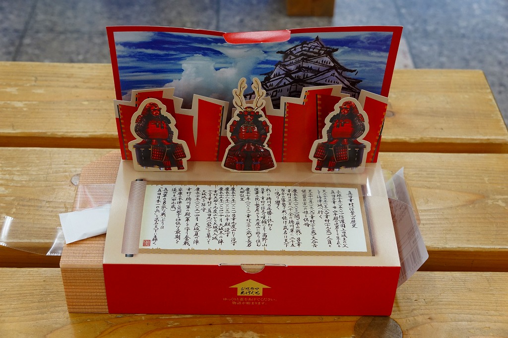 2016(平成28)年のNHK大河ドラマ「真田丸」の放送にちなんで、主にその放送期間中に発売か。値段は売店で900円と表示されたが、常に810円で販売された模様。「真田」と大きく書いた真っ赤なボール紙箱のふたを上げると、真田三代の甲冑が飛び出てきた。
