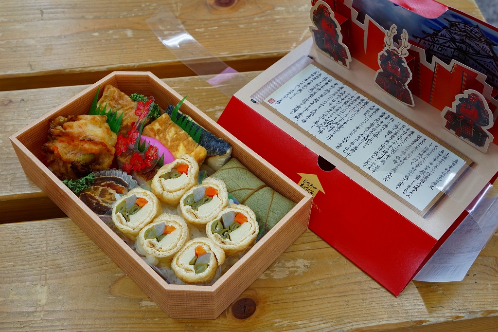 中身は白飯の上に「田舎巻き」なる高野豆腐やインゲンなどの油揚げ巻きが6個と、すり身揚げ、湯葉包み、鶏照焼、焼サバ、かまぼこ、玉子焼、菊花などの柿の葉ずし1個、ゆず柿など。食材の内容も形も並べ方も、千円以下の駅弁なのにとてもきれい。食べた後に四方紅の敷紙が底から出現し、高級感がぐっと増した。2017年の初頭頃までの販売か。