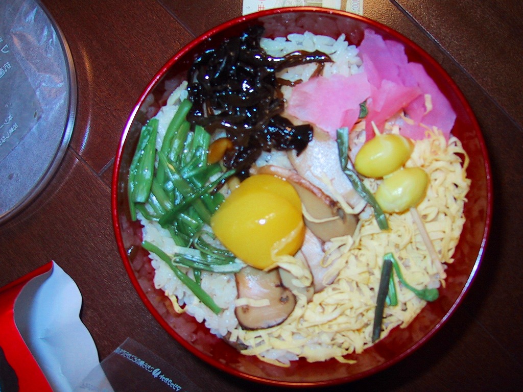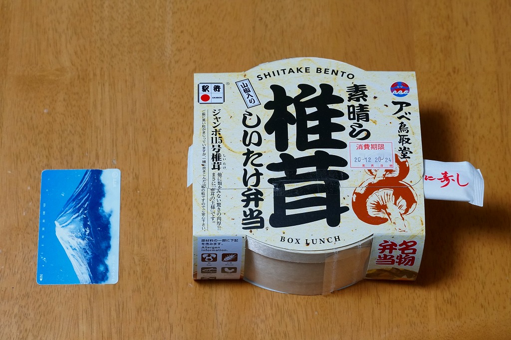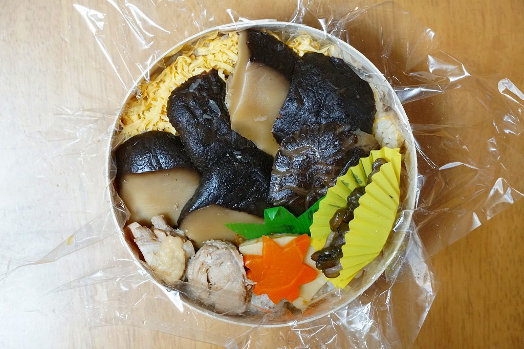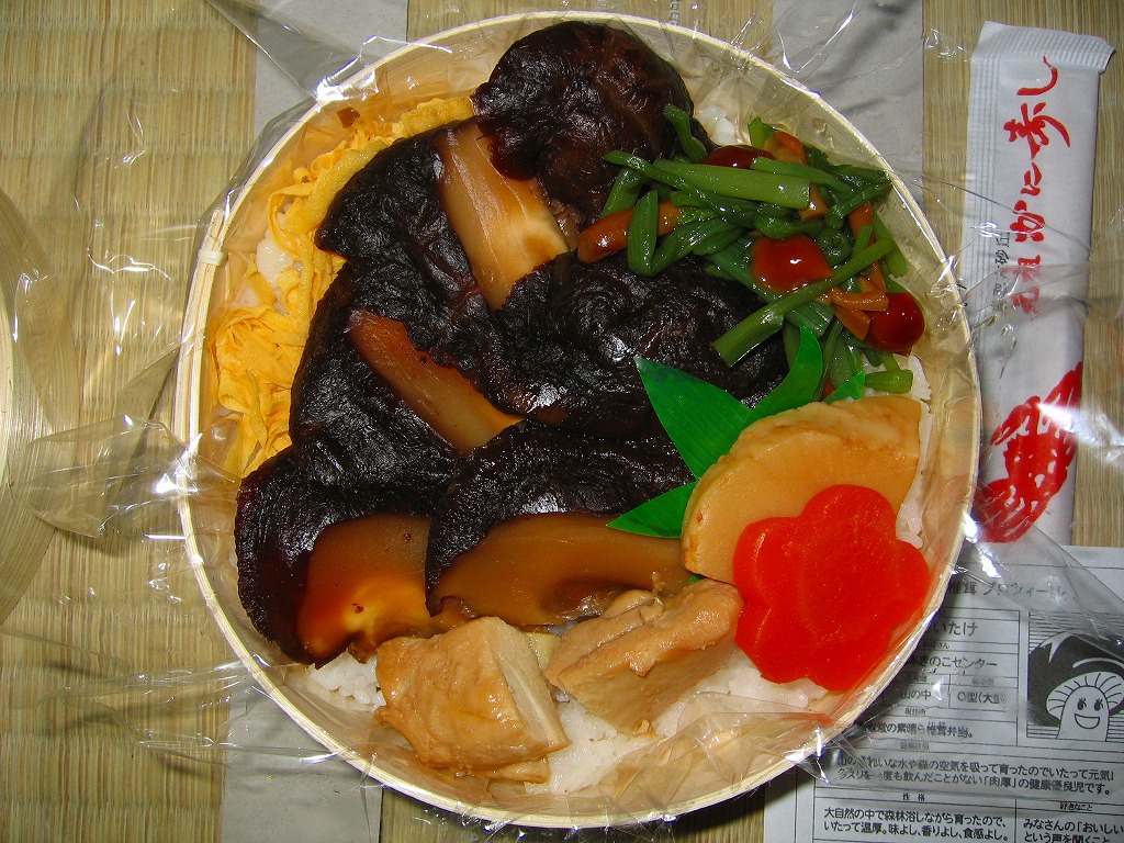 2004(平成16)年8月に発売。真ん丸の容器に山椒の炊込飯を詰め、大きくて肉厚のシイタケ煮を載せ、鶏肉煮、タケノコ煮、ニンジン煮、きゅうり酢漬けを添える。気持ち悪いほど大きなメインの椎茸には、意外にも普通の椎茸と同等以上のうまみが詰まっていて、駅弁に稀な椎茸丼としてモリモリ食べられる。