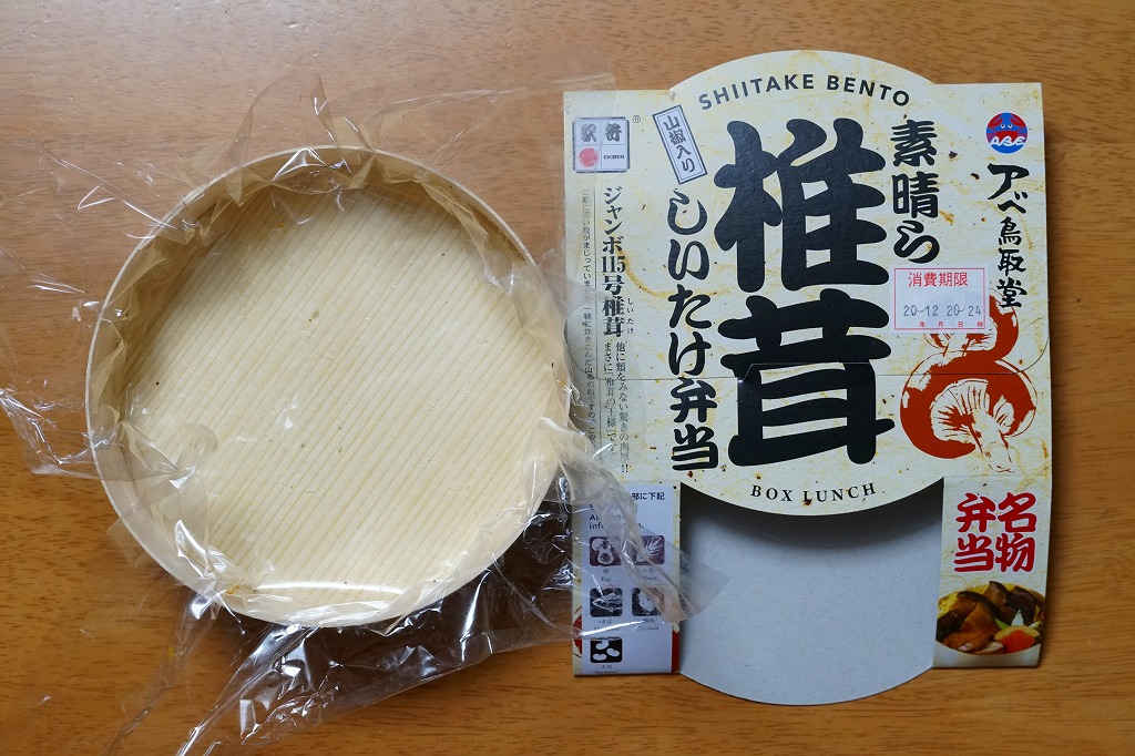 上記の駅弁「素晴ら椎茸しいたけ弁当」の、2004(平成16)年時点、発売時点での姿。値段、椎茸の名前、容器のふたの形状、山椒でなく餅米を混ぜた御飯が、上記の16年後と異なる。逆にそれくらいしか違いのない、駅弁らしいロングセラー商品となった。