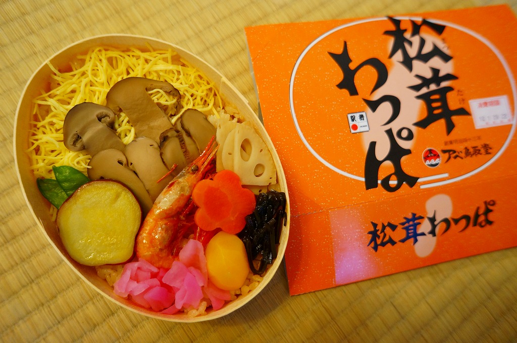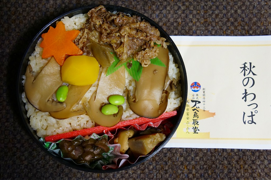 2000年代の駅弁「松茸わっぱ」を置き換えて、2020(令和2)年に発売か。これは秋季の駅弁か、催事向けの商品か。東京駅の季節のおこわ駅弁と同じような長方形の容器に、マツタケとマイタケの炊き込み御飯を詰め、マツタケのスライス煮、牛しぐれ煮、ささがきごぼうを載せ、枝豆とにんじんとクリで彩り、きゅうりの醤油漬けと玉子焼を添える。マツタケの視覚と牛肉の味覚で茶飯をいただく、松茸飯というよりは炊込飯タイプのお弁当に思えた。価格は2020年時点で1,000円、2024年時点で1,250円。
