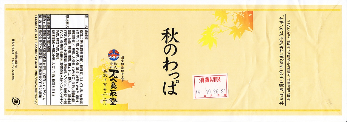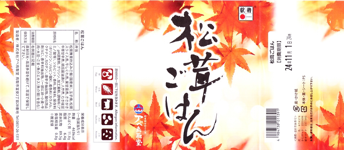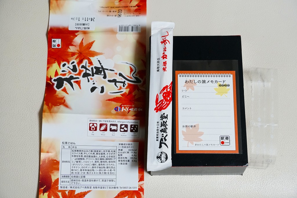 鳥取駅弁で初めて、ひもを引くと8分程度で暖まる加熱機能付き容器を使う。中身は味付け御飯の中と上にスライス松茸が載り、殻付き海老や煮物類に付け合わせが添えられる、容器を別にすれば全国各地で見られる松茸駅弁。「元祖かに寿し」に飽きたらこちらをいただこう。価格は2001年の購入時で1,000円、後に1,100円、2011年の鶴屋百貨店の駅弁大会で終売か。