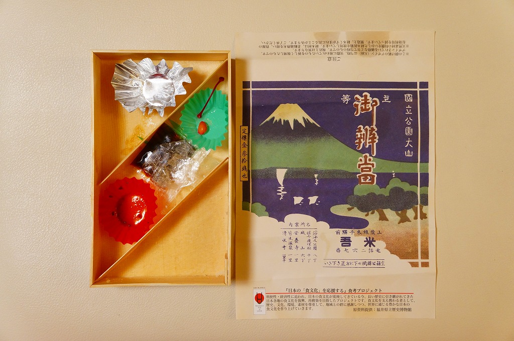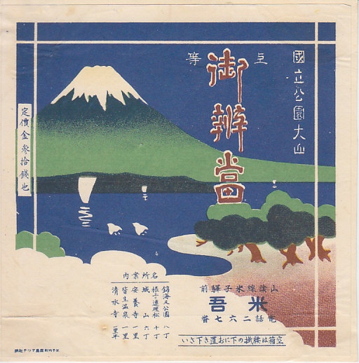 1930年代のものと思われる、昔の米子駅弁の掛紙。だから描かれる山は大山(だいせん)で、弓ヶ浜半島から美保湾越しの風景だろう。その姿はまるで富士山であり、三保半島から駿河湾越しの風景と言われたら信じそう。
