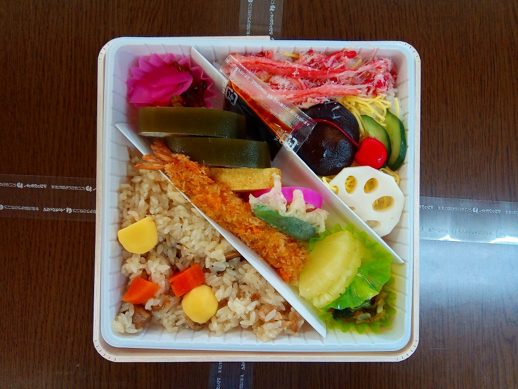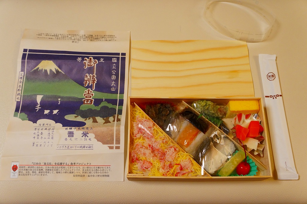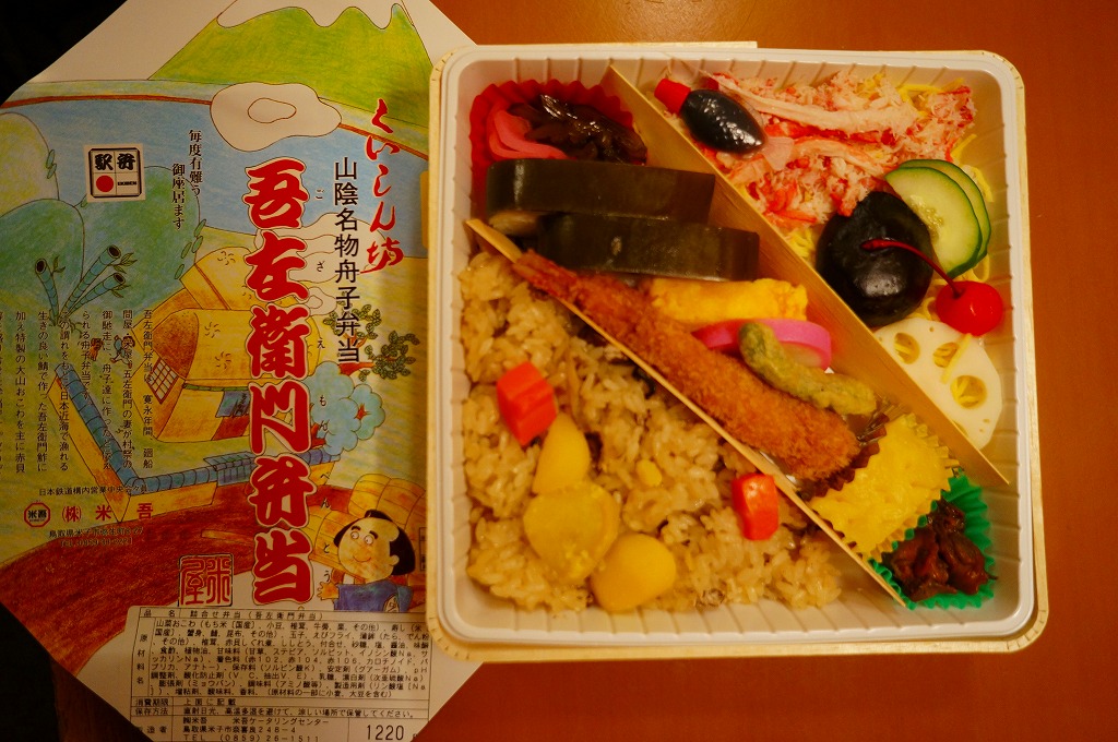 「くいしん坊」や「山陰名物舟子弁当」の副題が見える。掛紙によると、寛永年間、廻船問屋・米屋、吾左衛門の妻が村祭の御馳走に、舟子達に作ったと伝えられる舟子弁当だそうな。ふたまで経木折なのに、白いプラ製トレーにすべて収めた中身は、山菜おこわ、カニ寿司、吾左衛門鮓鯖、エビフライ、かまぼこと玉子焼、漬物などで、御飯たっぷりの内容。名前からして幕の内駅弁かと思ったら、そうではなかった。