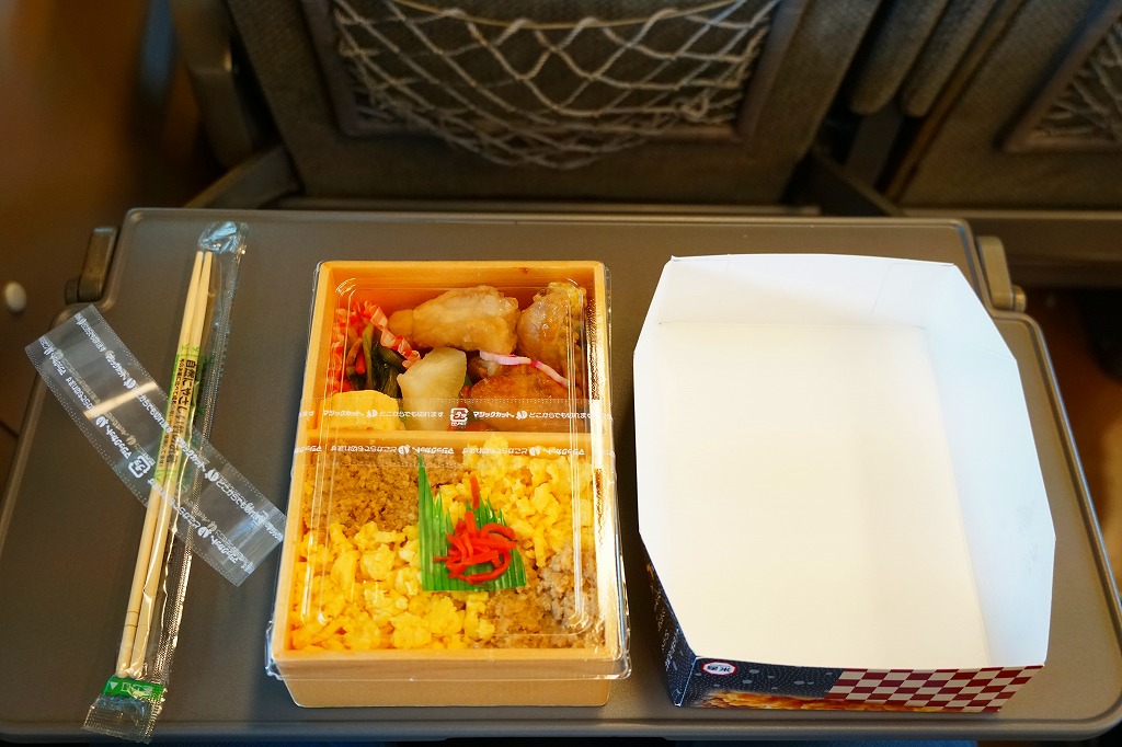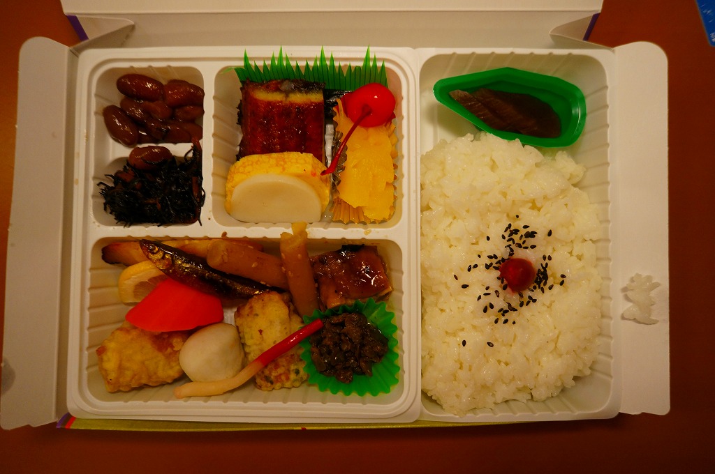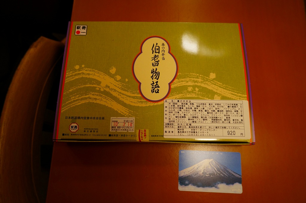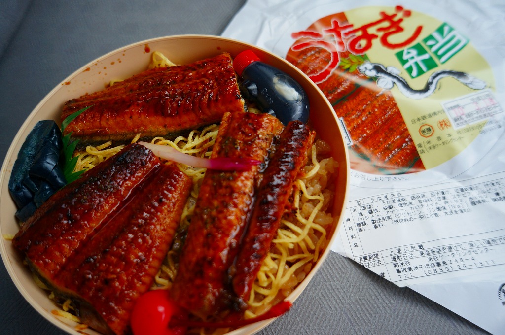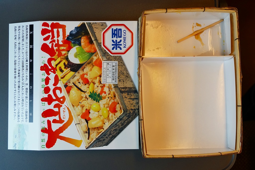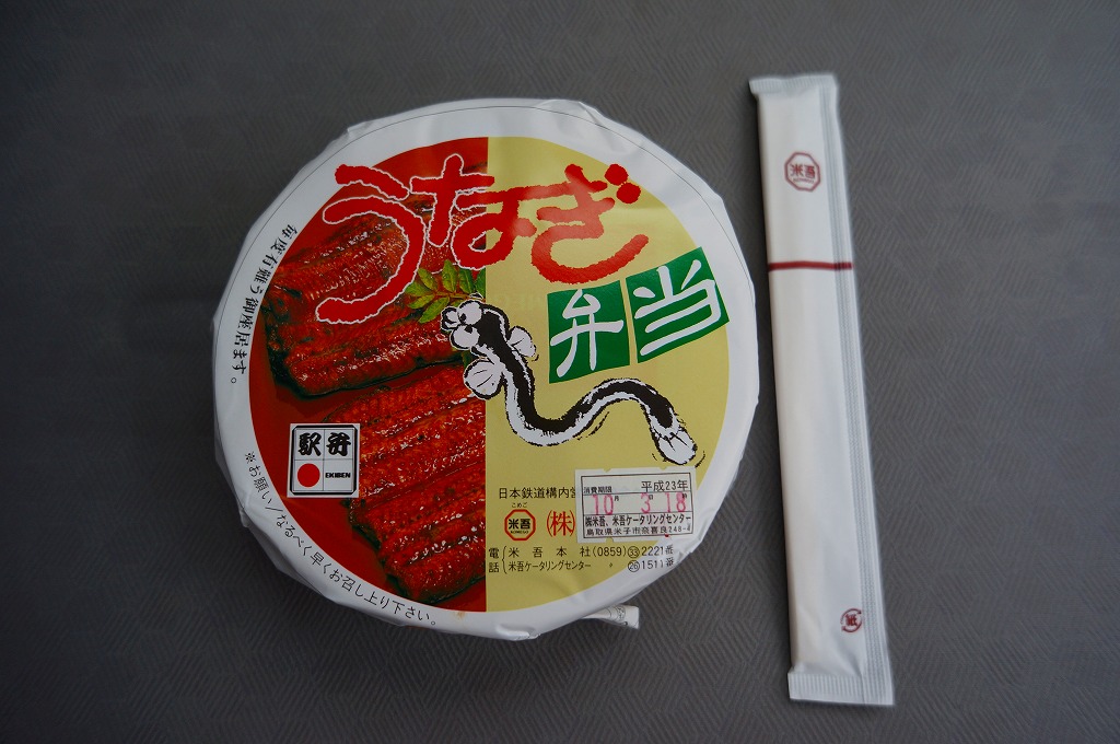 米子駅の幕の内駅弁。駅弁の名前を書いた専用のボール紙箱を使用、白いプラ製トレーに収まる中身は、日の丸御飯に奈良漬、かまぼこと玉子焼とうなぎ蒲焼、シジミ煮、マス唐揚、ワカサギ甘露煮、ニンジンやサトイモなどの煮物、焼サバ、ちくわ磯部揚、ひじき煮、煮豆、パインとチェリーなど。初見は仕出し弁当風も、多種のおかずの味が常温で生きる駅弁の鑑。価格は2010年時点で920円、2014年4月の消費税率改定で950円、2020年時点で970円、2023年時点で1,188円。