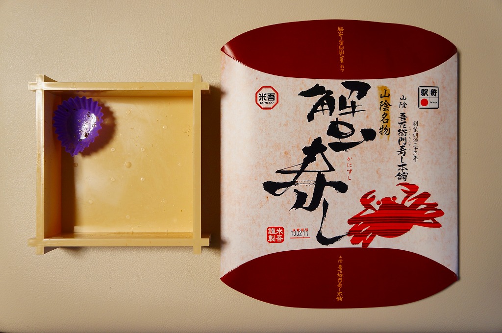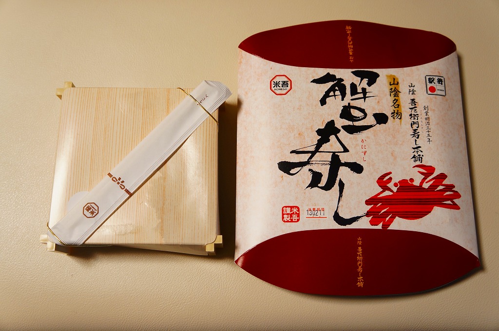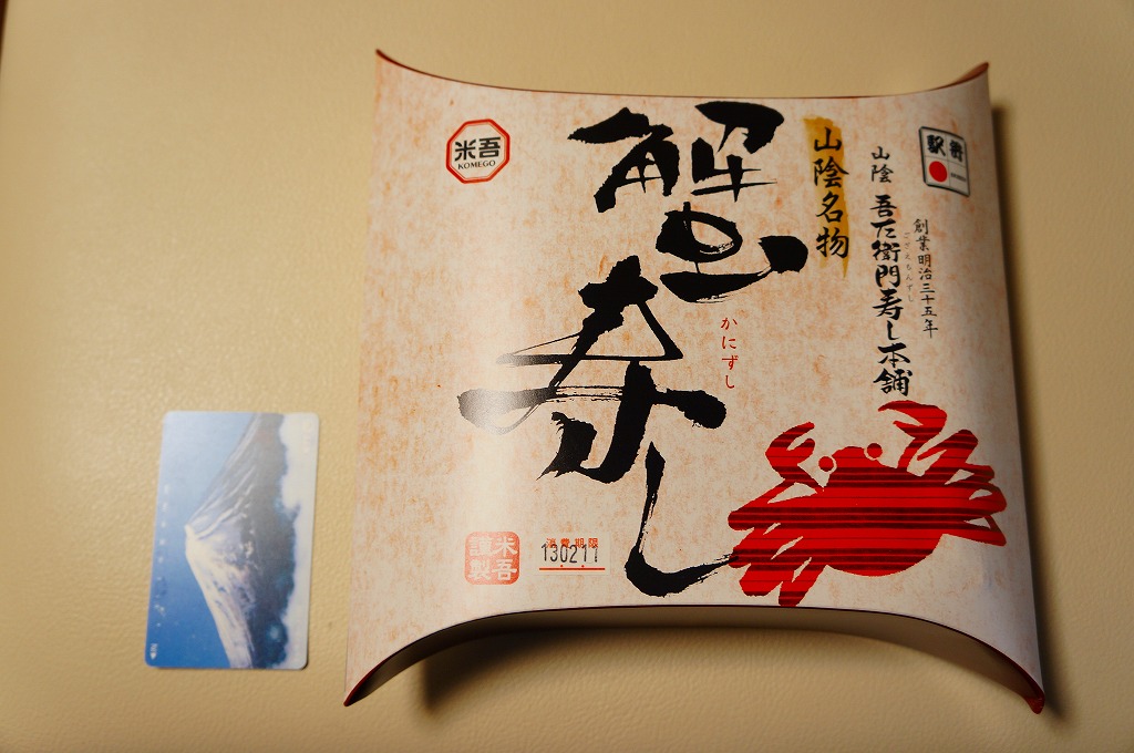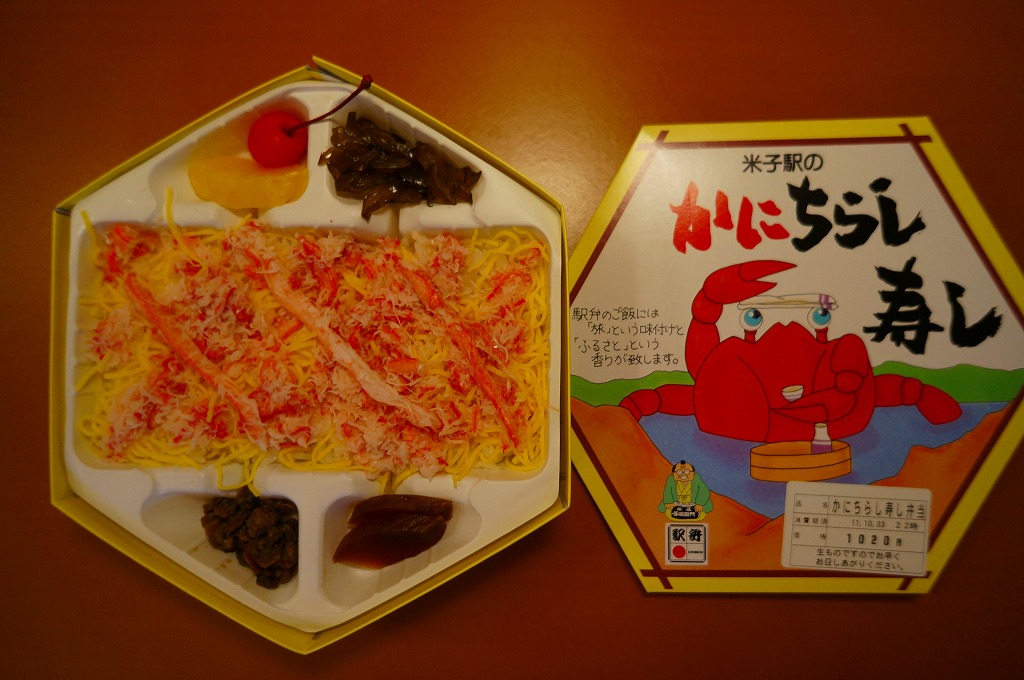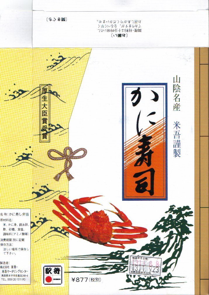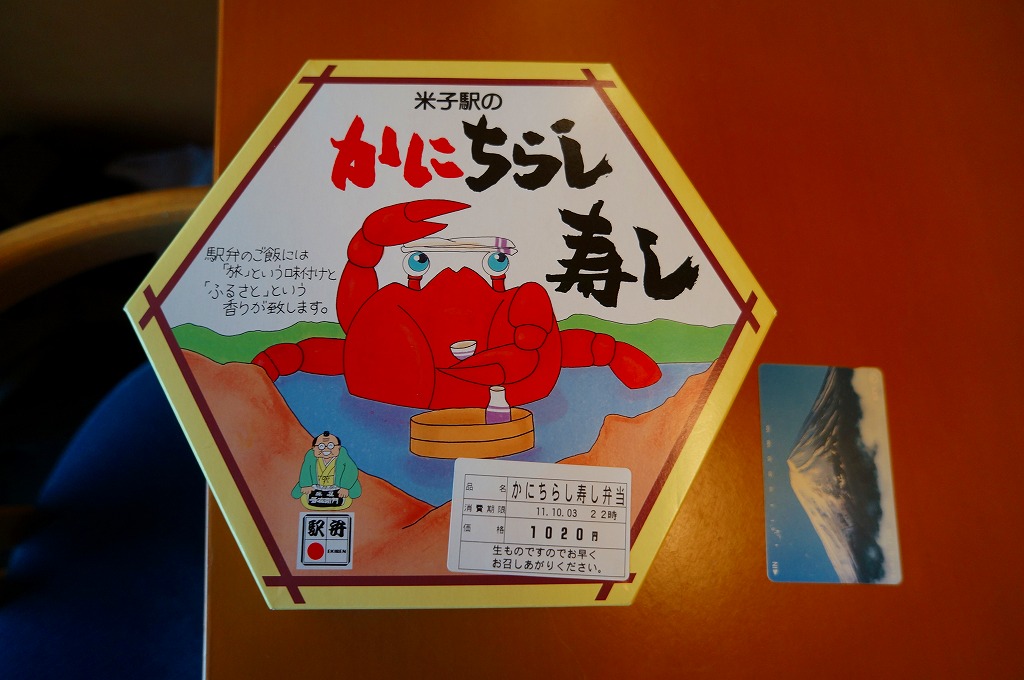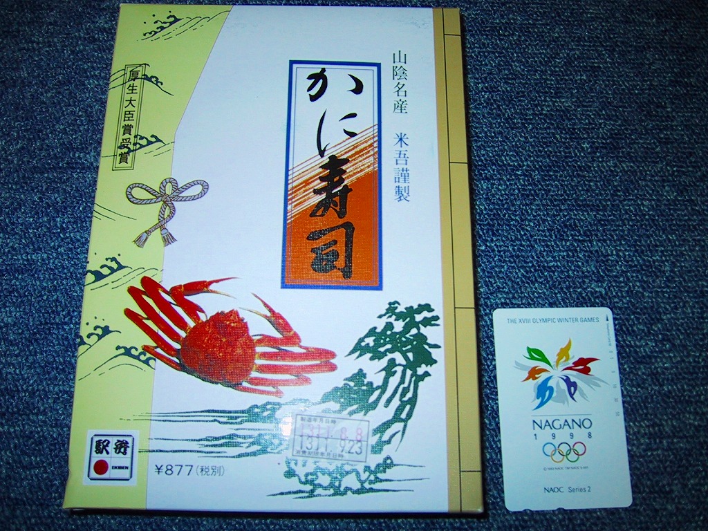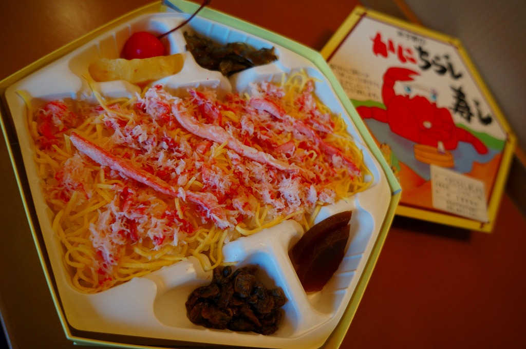 上記の駅弁「山陰吾左衛門寿し本舗蟹寿し」の、2001(平成13)年時点での姿か。長方形のボール紙製のパッケージにホカホカ弁当風な簡素な容器が入る。中身は酢飯の上に錦糸卵とカニの身が載るだけのシンプルな構成。昭和中期には登場しているはずが、なぜか時刻表や調製元のウェブサイトなどの資料に登場しない、幻?の駅弁。ただし味はよい。