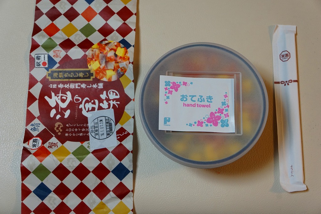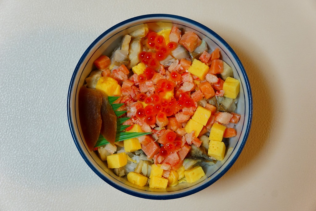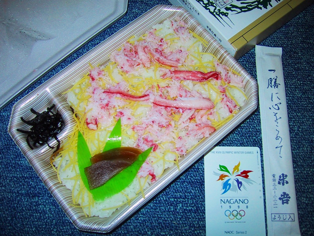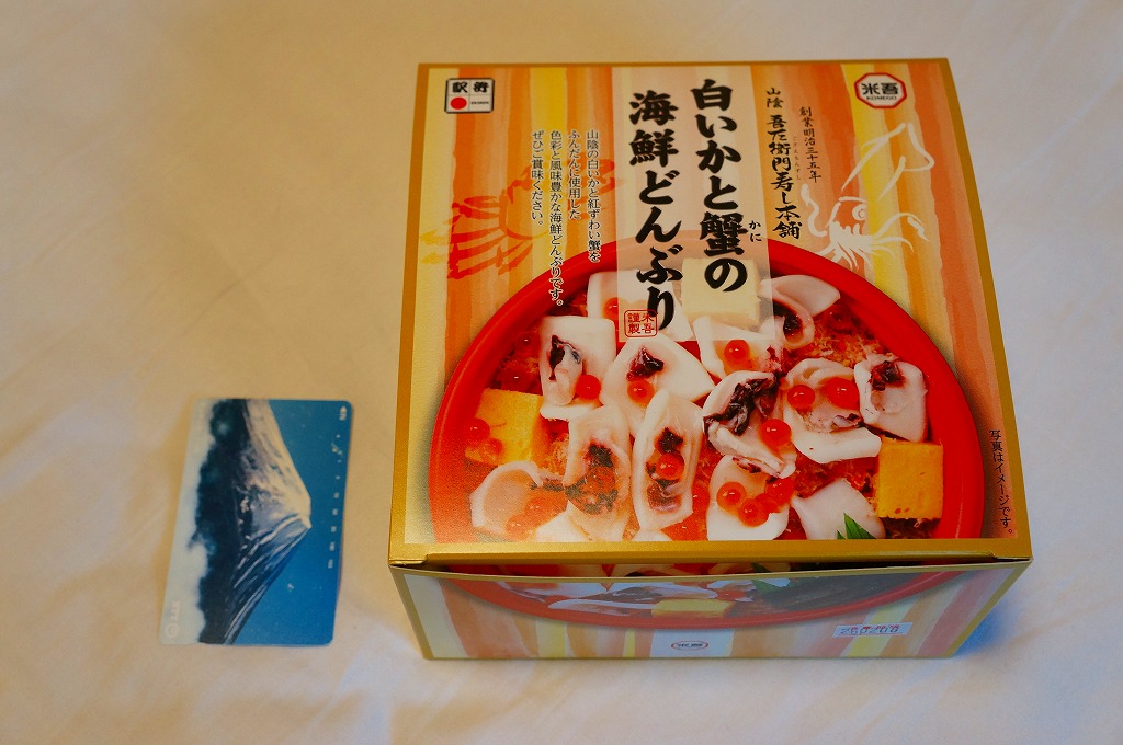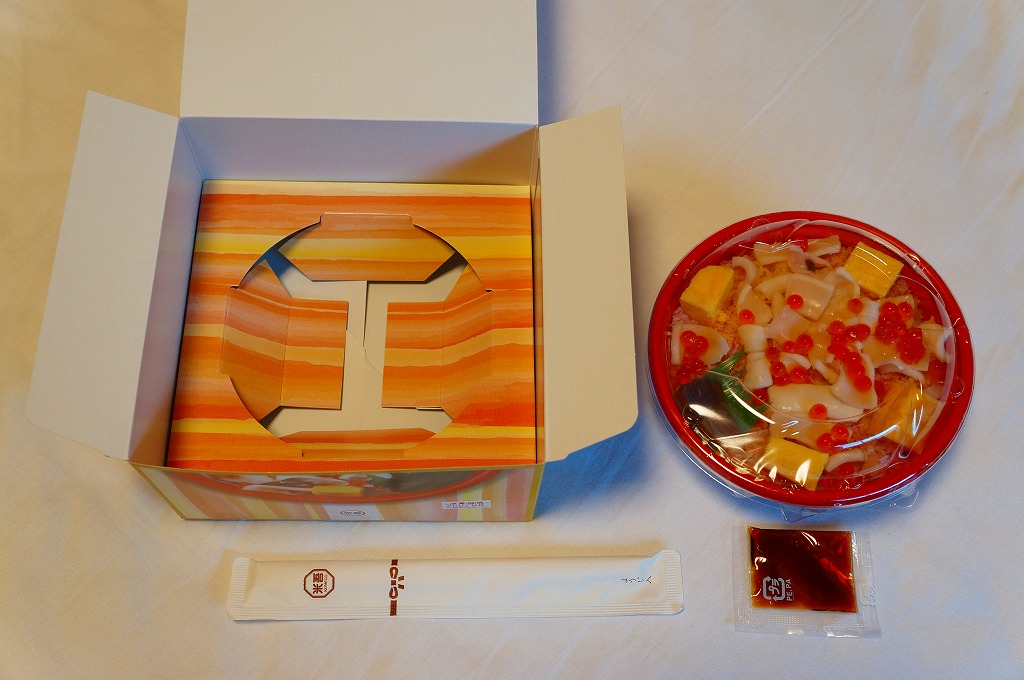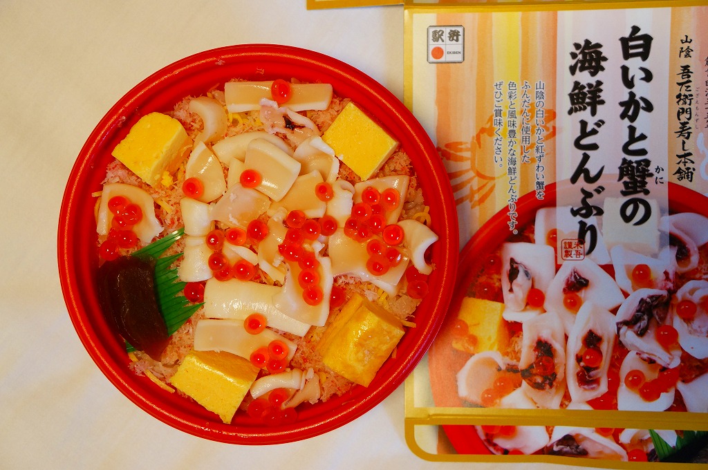 2013〜2014年の駅弁大会シーズンのみの販売か。現地で売られたかは定かでない。丼に酢飯を詰め、錦糸卵、カベニズワイガニのほぐし身、玉子焼、白いか、イクラを散らし、奈良漬けを添える。柔らかいイカの香りを楽しめた。
