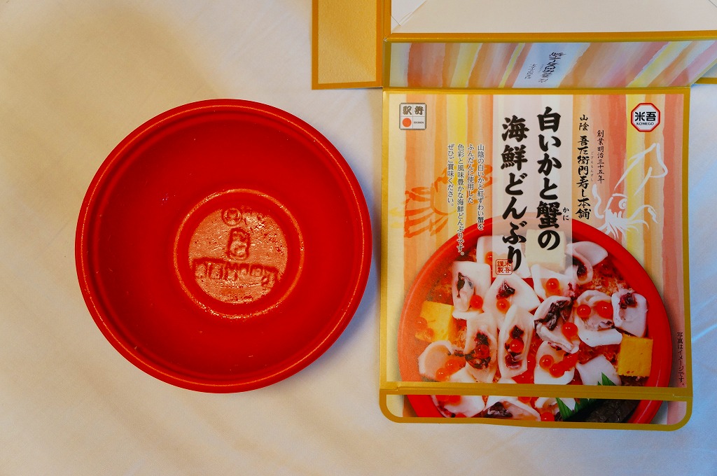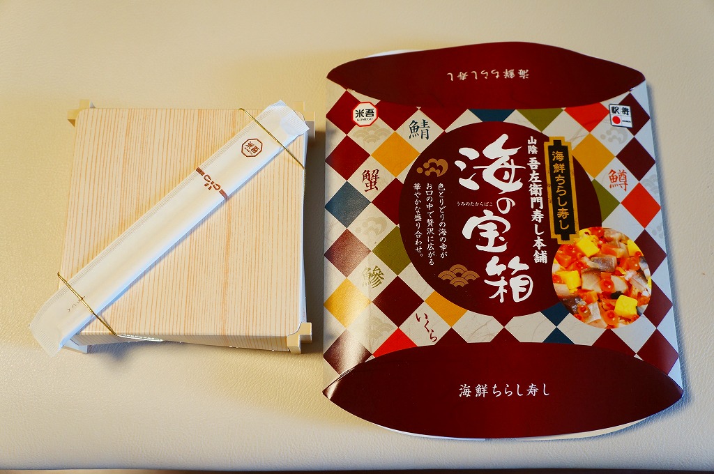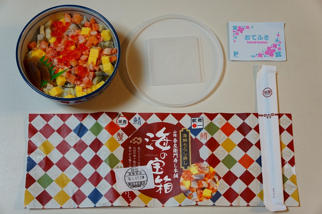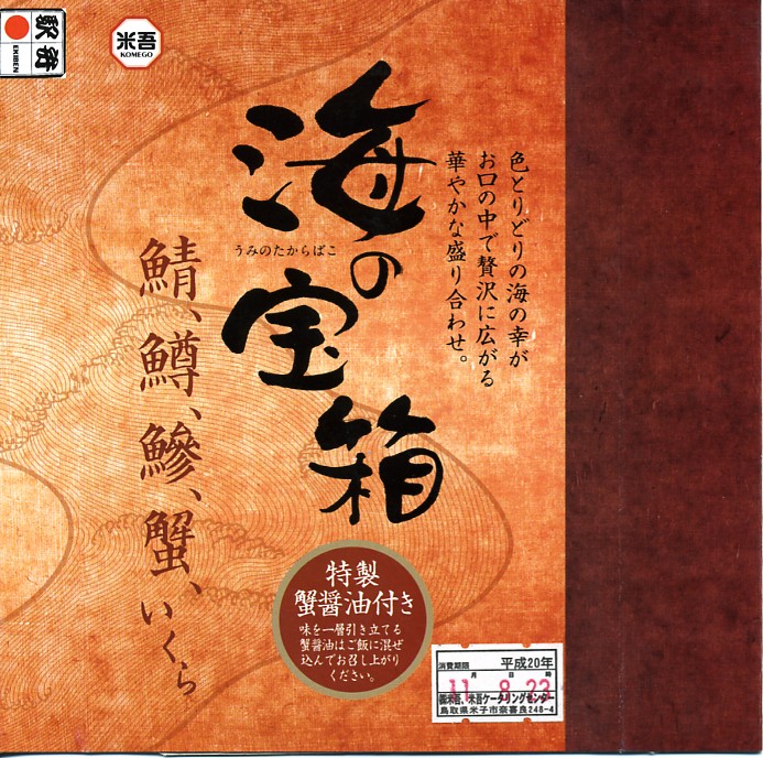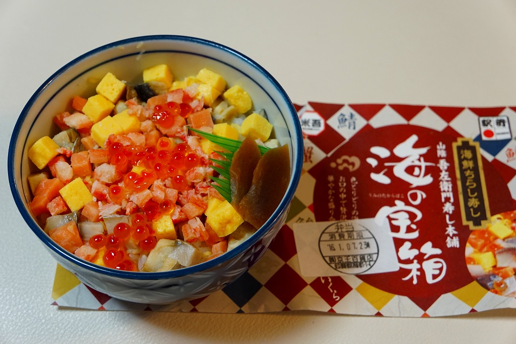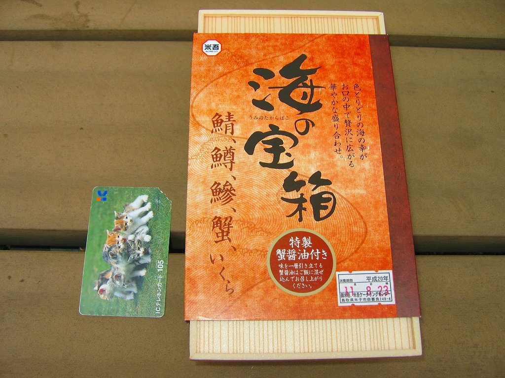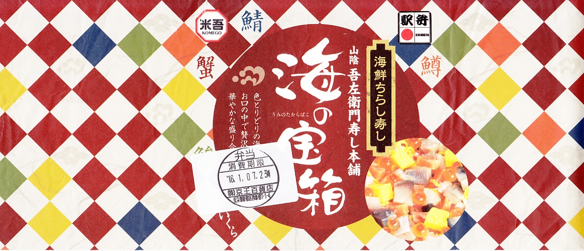 米子駅の駅弁「海の宝箱」について、2016(平成28)年1月の京王百貨店の駅弁大会で、容器に「51回記念元祖有名駅弁と全国うまいもの大会」どんぶりを使い、一日あたり300個を1,500円で実演販売したもの。前年に名古屋駅「抹茶ひつまぶし日本一弁当」で同じことをした際には、連日即売切の大人気であったのに、これは不人気。中身は通常版と同じはずが、暖かく乾燥した催事場で長く留め置かれたためかどうか、酢飯は酸味が強く、具はパサパサで、いつもの味が出ていなかった。