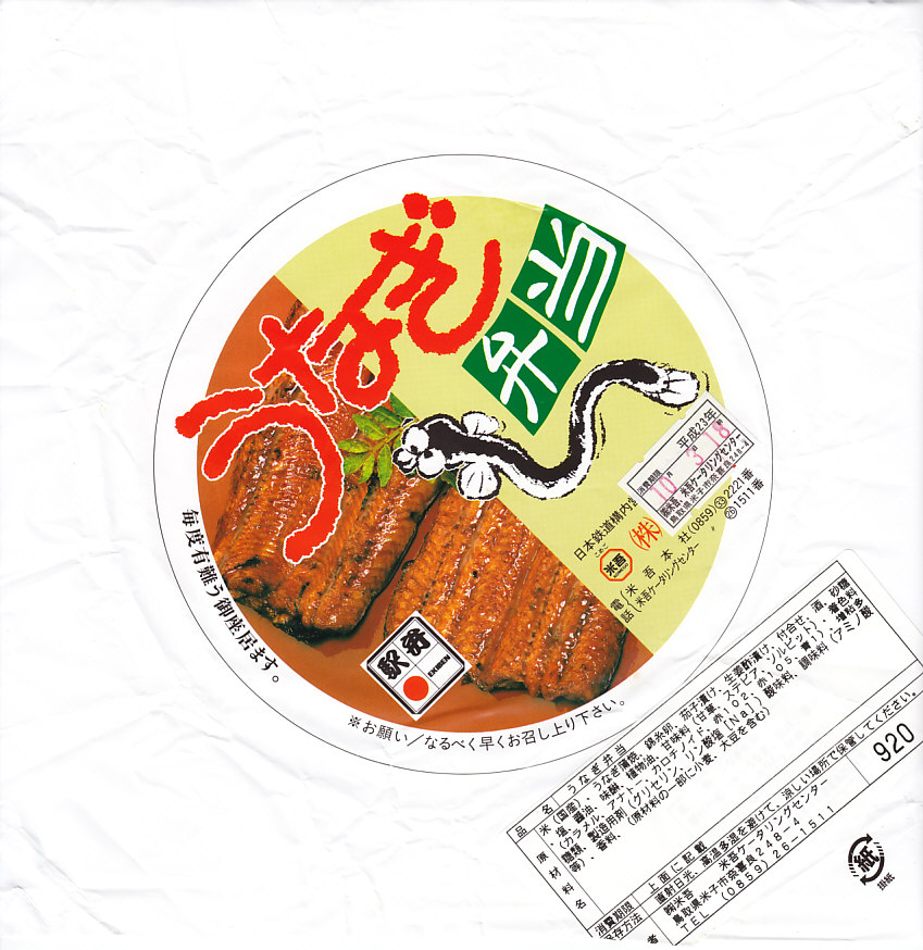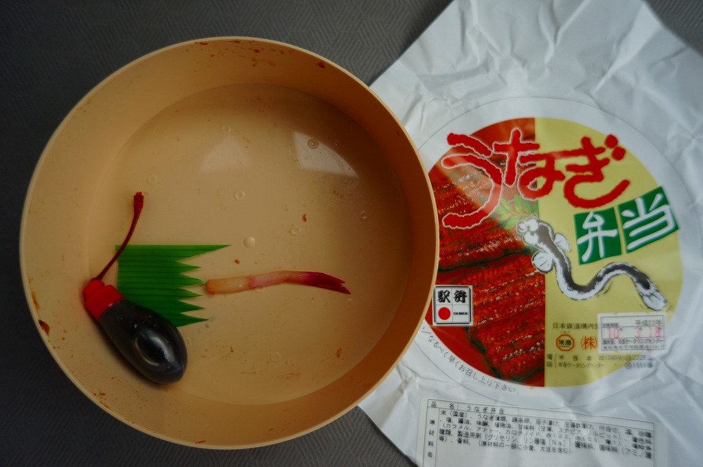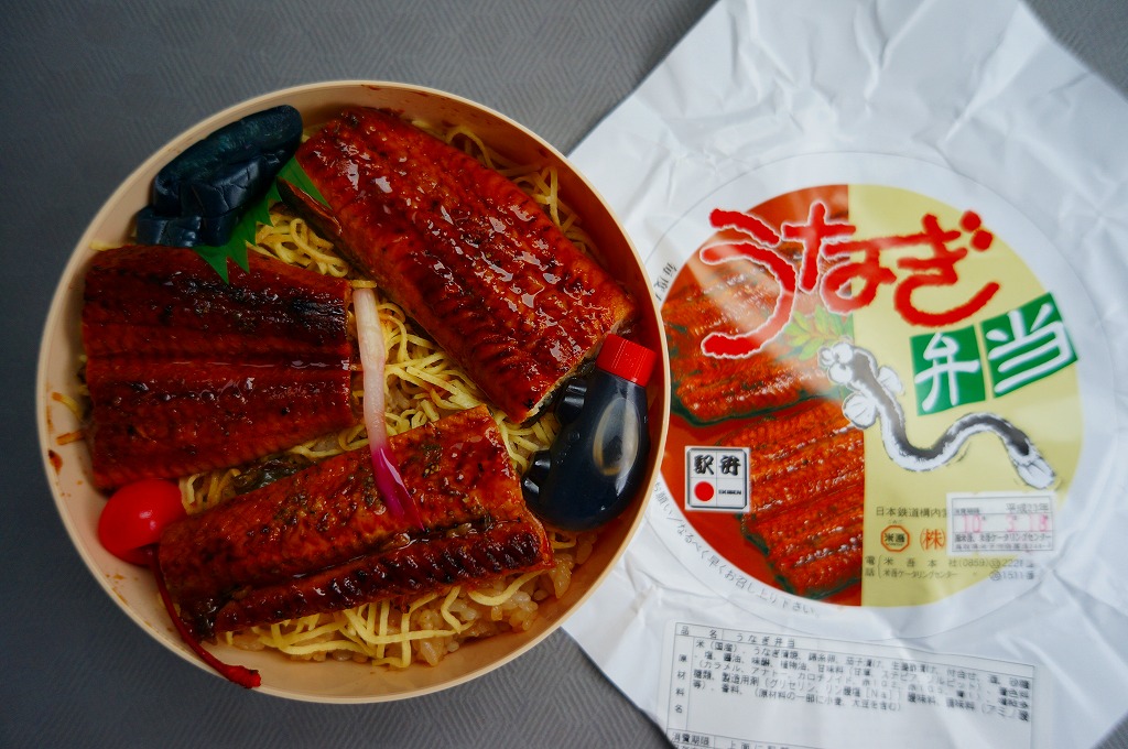 円形の硬いプラ製容器に、ウナギ蒲焼の写真やウナギのイラストなどを描いた掛紙をかける。中身は茶飯を錦糸卵で覆い、ウナギ蒲焼を3切れ載せて、たれとナス漬けとはじかみとさくらんぼを添えたもの。メインのウナギは安っぽい弾力感のあるものであったが、分量は確保されているし、見栄えも掛紙写真と同じ。価格は2011年の購入時で920円とお買い得だったが、ウナギの高騰のためか、2014年時点で1,260円、2015年時点で1,300円に値上げ。2015年までの販売か。