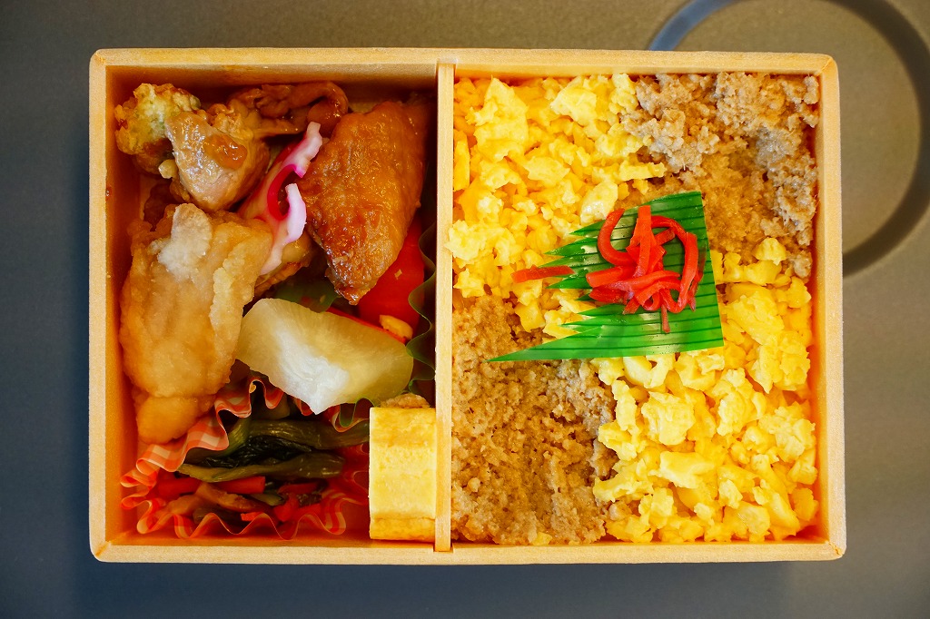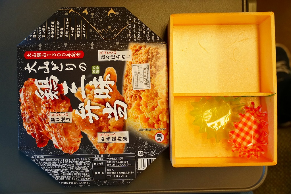 中身は半分が鶏飯で、白飯を大山どりの鶏そぼろと玉子そぼろで覆い、紅生姜で彩るもの。半分がおかずで、大山どりの照り焼き、大山どりの油淋鶏(ゆーりんちー)または中華風酢鶏、大山高原野菜のお漬物、季節のお浸し、玉子焼、ちくわ磯辺揚、にんじんとだいこんの煮物、花れんこん。鳥取県米子市の鶏肉製造工場の商品「大山どり」をふんだんに使った鶏飯。価格は2017年の発売時で1,200円、2020年時点で1,250円、2023年時点で1,296円。
