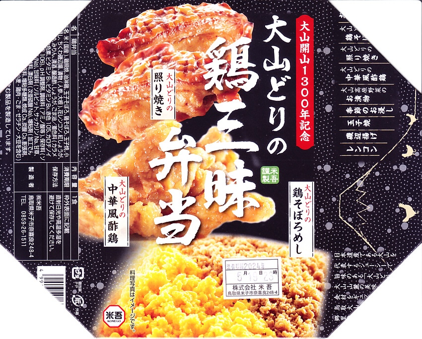 翌年の大山(だいせん)の開山1300年を記念して、2017(平成29)年4月までに発売。発売当時は2017年5月から2019年10月まで鳥取県が実施した事業「大山開山1300年祭」のロゴマークを初めて付けた新商品として、その発売は鳥取県知事が同席し記者発表された。長方形の容器に被せた紙のふたには、商品名とおしながきと、中身とした3種の鳥料理の名前と写真を描く。