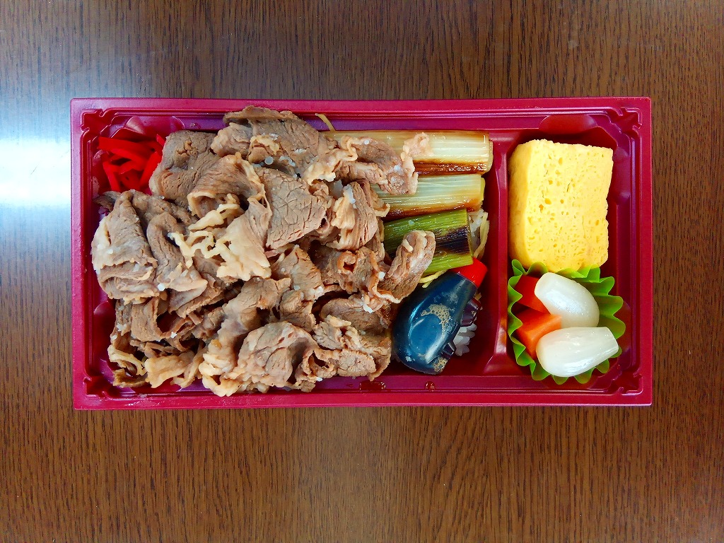 2014(平成26)年の発売か。白飯を牛肉で覆い、白ネギ焼と紅生姜とタレを付け、玉子焼とラッキョウ漬を添える、全国各地でよくあるタイプの牛肉駅弁。米子駅の駅弁は「吾左衛門鮓」シリーズその他、棒寿司や酢飯の駅弁だらけなので、こういう普通のものがあると不思議な感じ。固めの味は、ふわふわしていた。価格は2016年時点で1,080円、2020年時点で1,100円、2023年時点で1,458円。