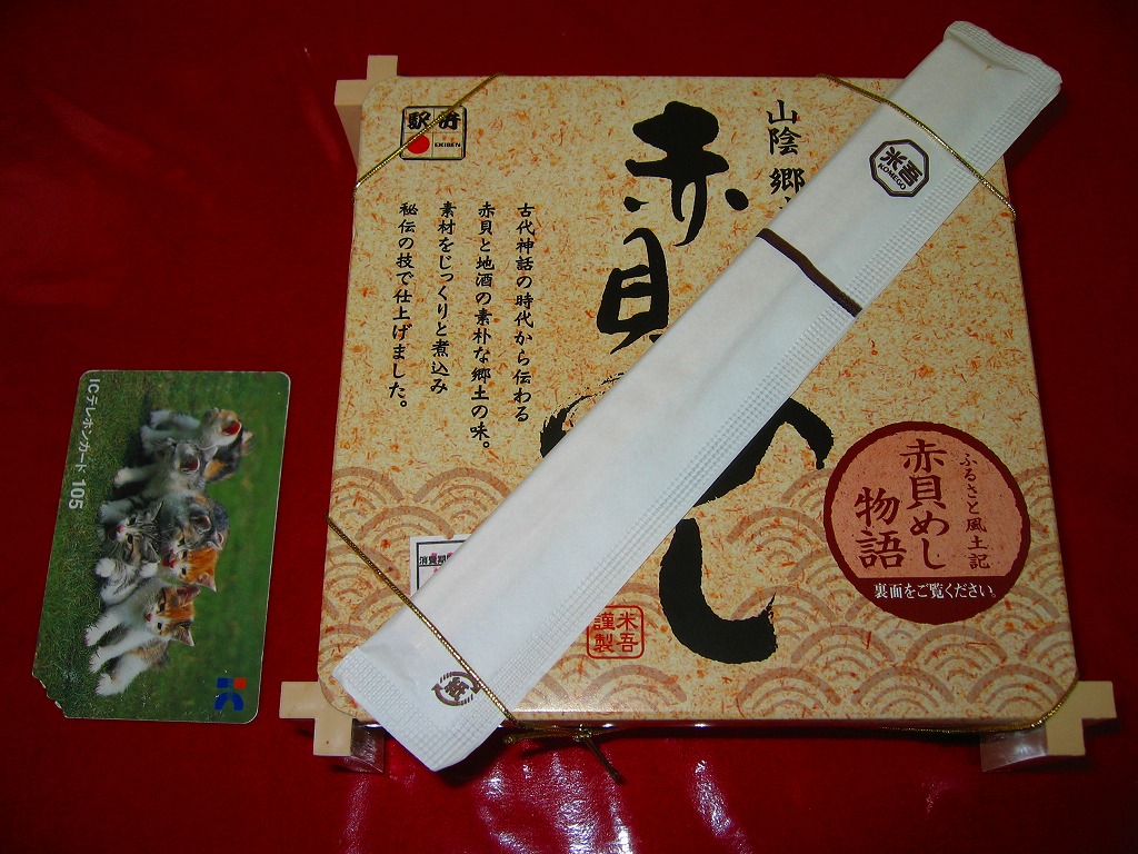 催事場ブースでの主役は吾左衛門鮓で揺るぎないだろうが、こちらも味で負けないなかなかの駅弁。現地で販売されているかは分からないが、赤貝飯は出雲の郷土料理であるため、駅弁になくても食堂や弁当で食べることはできるだろう。価格は2008年の購入時で900円、2014年4月の消費税率改定で930円。2017年までの販売か。