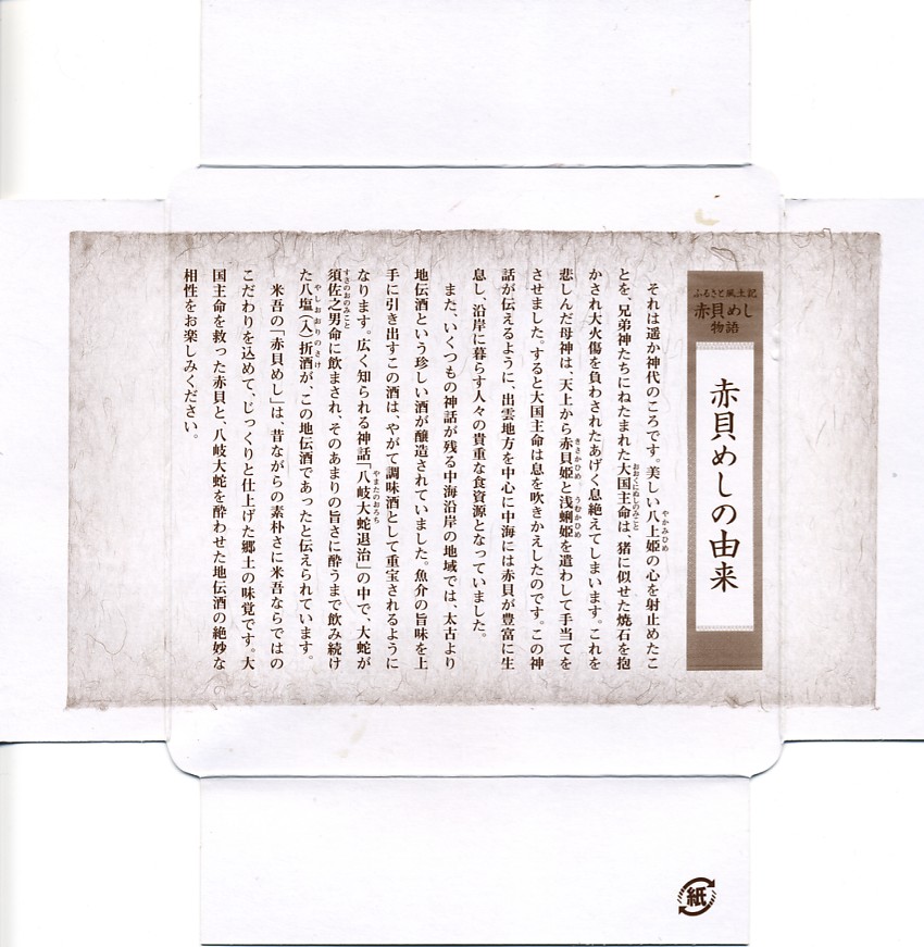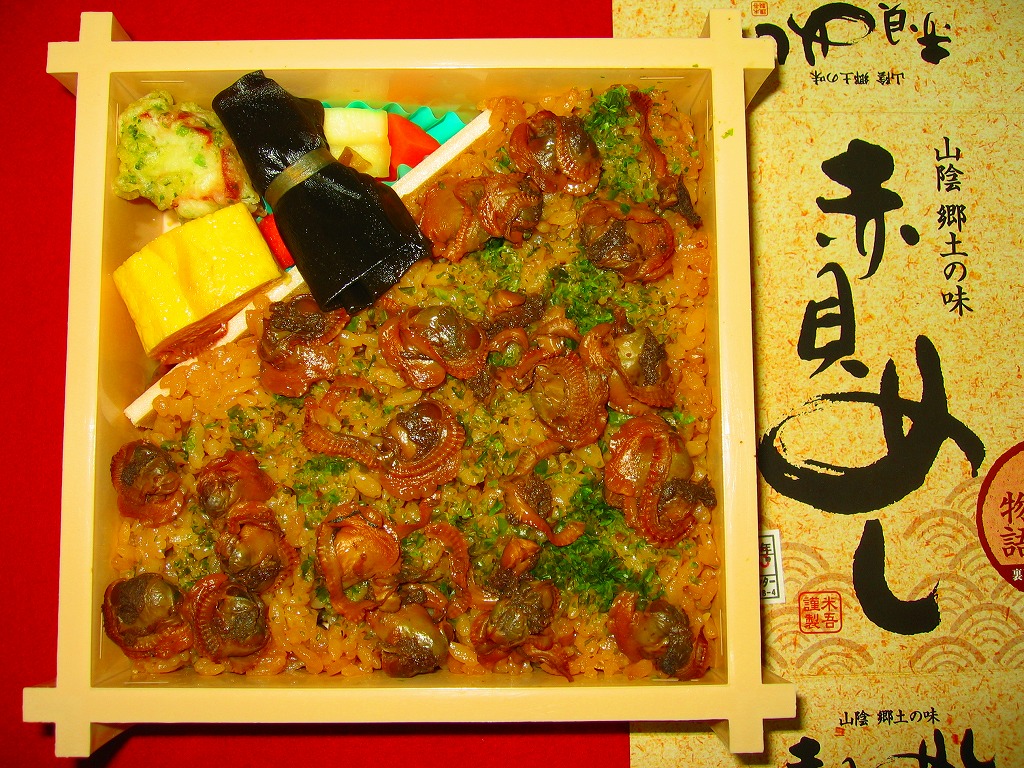 秋冬の駅弁大会シーズンに向けた、2008(平成20)年秋の新作で、吾左衛門酢(吾左衛門寿し)の実演販売での併売商品として誕生したと思われる。プラ製の井形の容器に、表面に商品名を、裏面に由来文を書いたボール紙でふたをする。中身は茶飯の上に赤貝(サルボウ貝)を30個程度ばらまき、昆布巻や玉子焼、カマボコ揚や煮物などを添えるもの。