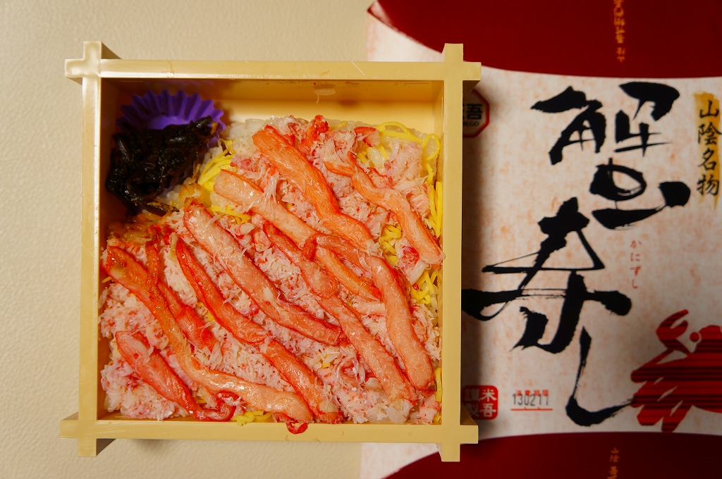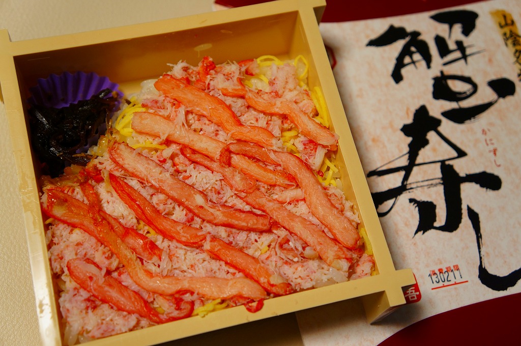 クリーム色で正六角形のボール紙製容器には、カニが中海に漬かっているようなマンガが描かれる。白いプラ製トレーに収まる中身は、酢飯を錦糸卵で覆いベニズワイガニのほぐし身と細いカニ脚肉を載せ、パイナップル、しじみ、ワカメ佃煮、奈良漬、さくらんぼを添えるもの。つまり古き佳き時代からの山陰地方特有のカニ寿司駅弁。パインとさくらんぼを詰める点にも古めかしさが出ている。価格は2011年の購入時で1,020円、2014年4月の消費税率改定で1,050円。2017年までの販売か。