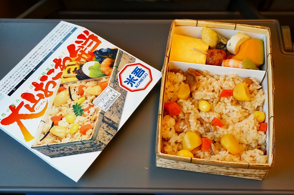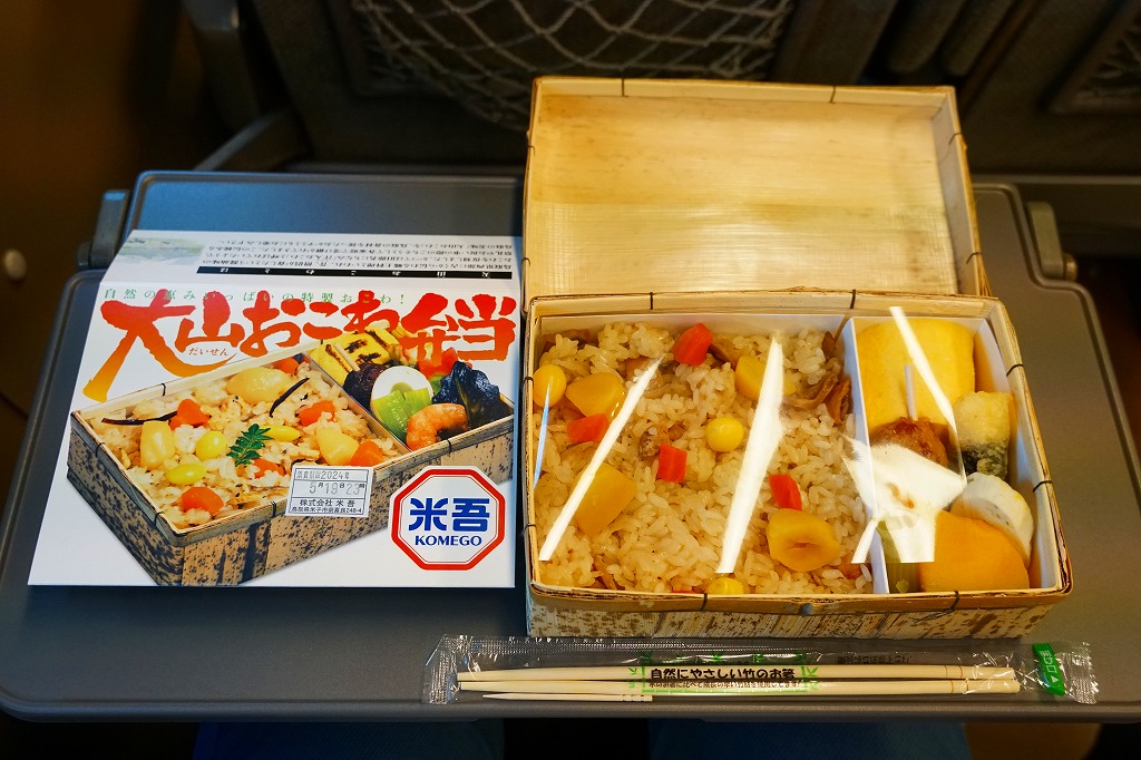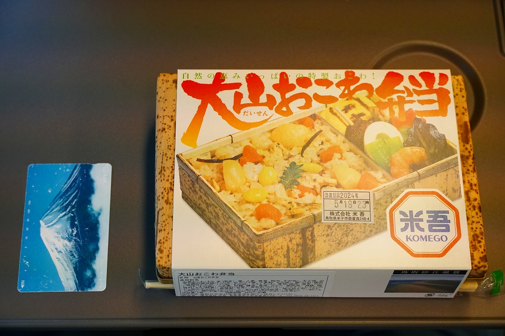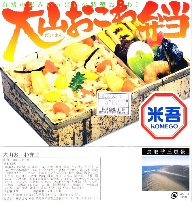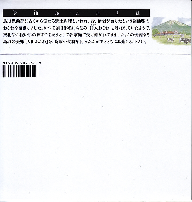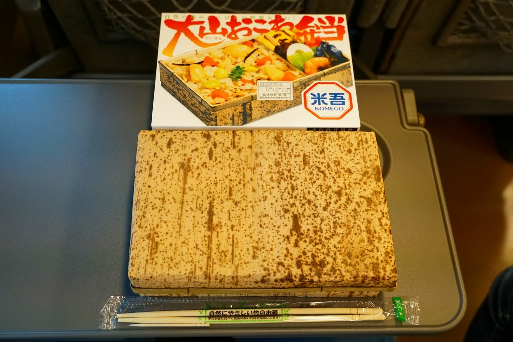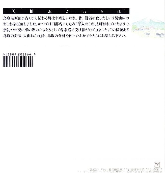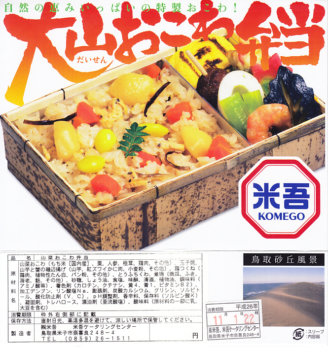 大山おこわは、鳥取県西部の大山山麓、伯耆国の汗入(あせり)エリアの郷土料理。祭事の料理としてのおこわそのものを指すようで、おこわであることと、できれば醤油味であること以外に、定義のようなものはないらしい。この駅弁も含め、商品やレシピで見る大山おこわはだいたい、醤油味の五目おこわ。大山の向こう側の岡山県真庭市や美作国の蒜山(ひるぜん)には、もち米に鶏肉や油揚げその他をふんだんに混ぜて蒸すという、結果的に大山おこわと同様の内容となる郷土料理、蒜山おこわがある。