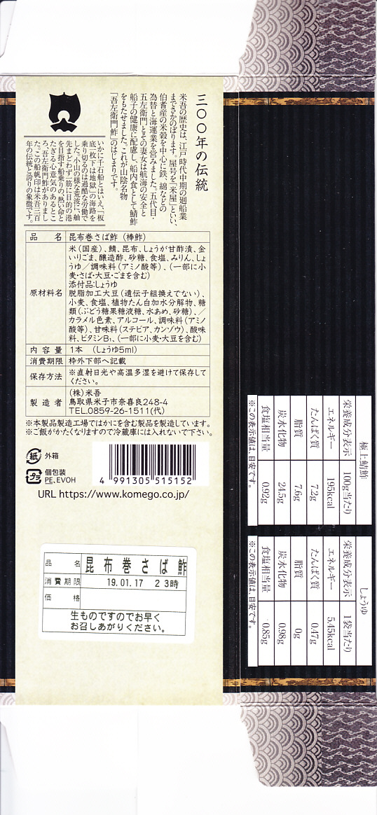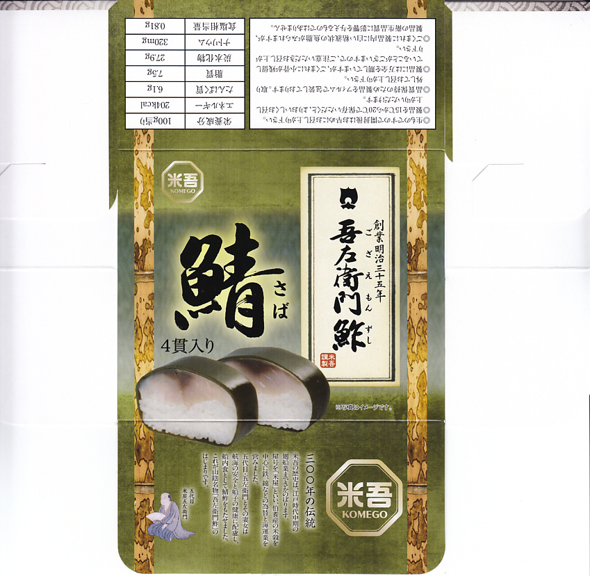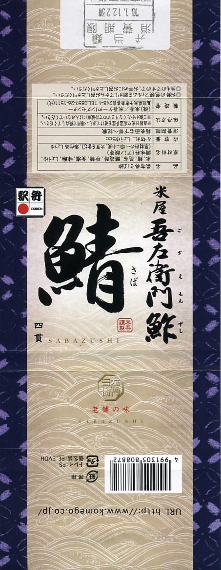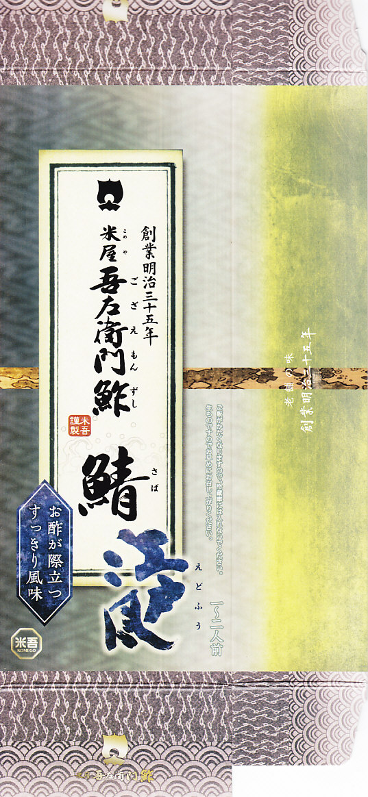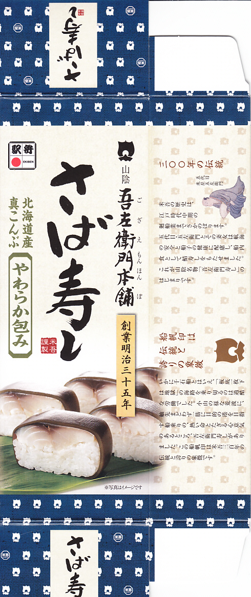 2004(平成16)年12月30日の調製である、米子駅弁のパッケージ。2008年8月までは現在の「吾左衛門鮓」ではなく「吾左衛門寿し」と表記されていた。読み方は同じ「ござえもんずし」。この頃は鳥取米ヤマヒカリの酢飯と境港のサバを合わせて、北海道日高産の昆布で巻いた商品だった。2004年度のJR西日本の駅弁キャンペーン「駅弁の達人」の対象駅弁。