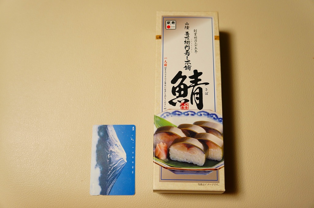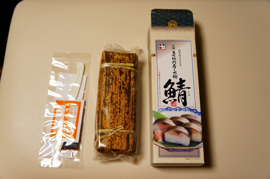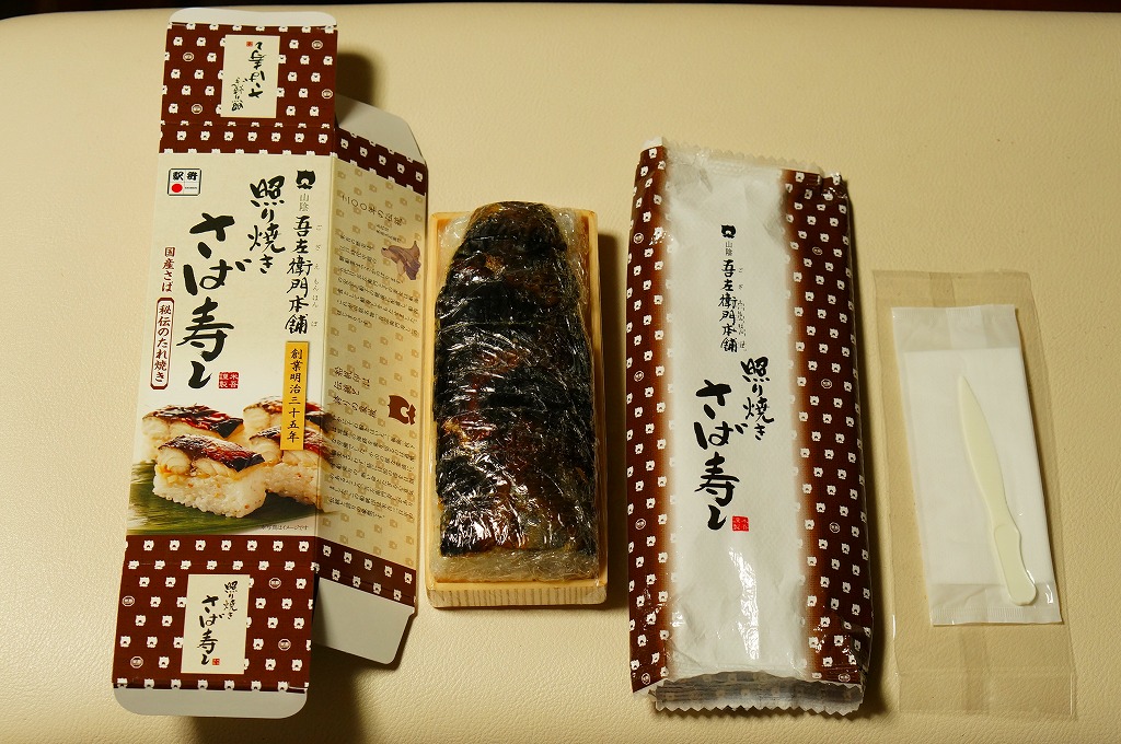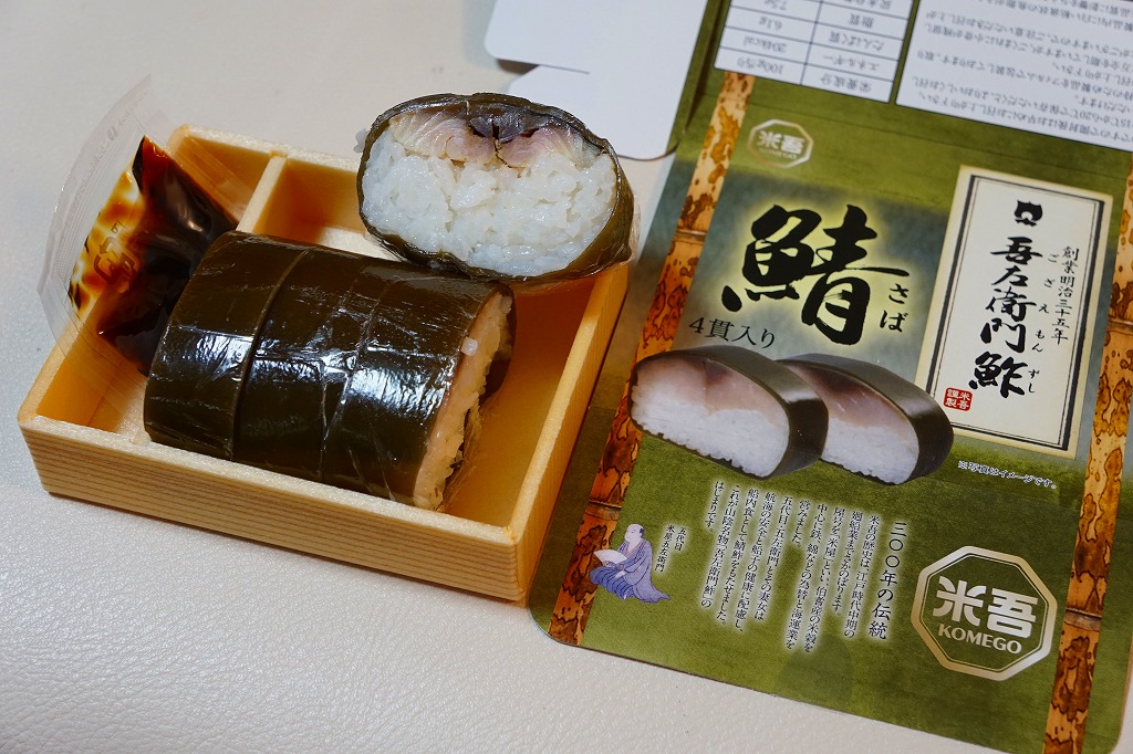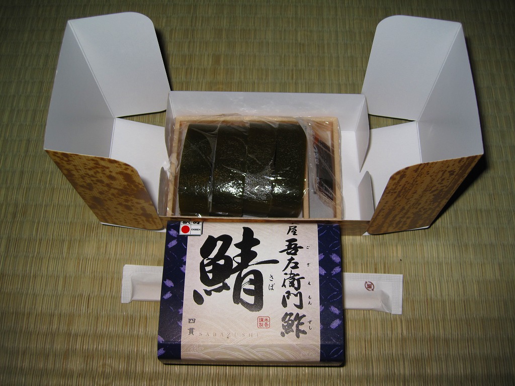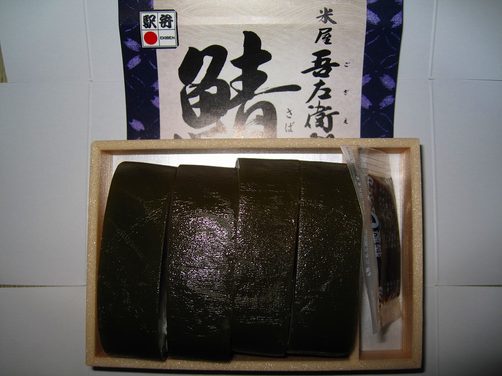 米子駅弁「吾左衛門鮓」のハーフサイズ。商品名のとおり、昆布に巻かれたサバの棒寿司を4切れ分、ラップに包まれたままカットされて、小箱に詰める。森駅の駅弁「いかめし」くらいの大きさしかないが、分量はこれが一人前でよいと思う。味は当然に、通常版と同じ。5貫入りは駅でも買えるらしいが、この4貫入りは催事向けか。