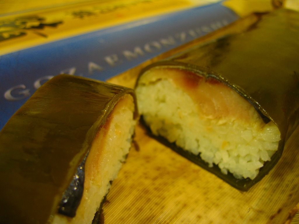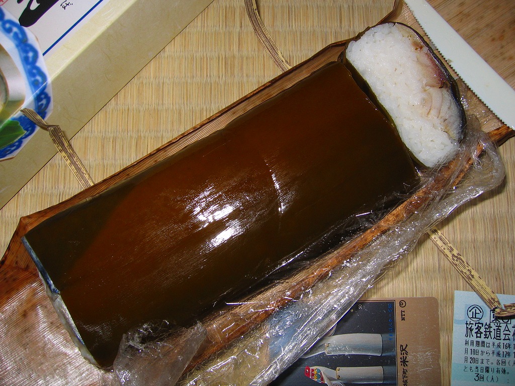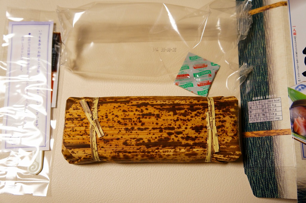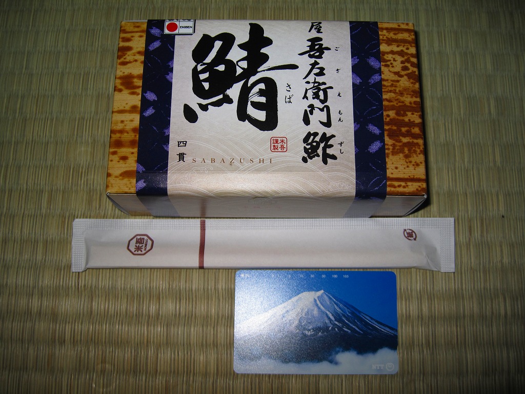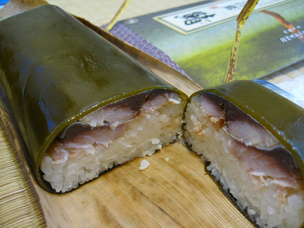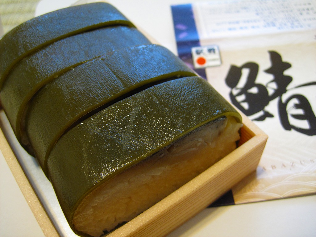 米子駅弁「吾左衛門鮓」のハーフサイズ。商品名のとおり、昆布に巻かれたサバの棒寿司を4切れ分、ラップに包まれたままカットされて、小箱に詰める。森駅の駅弁「いかめし」くらいの大きさしかないが、分量はこれが一人前でよいと思う。味は当然に、通常版と同じ。5貫入りは駅でも買えるらしいが、この4貫入りは催事向けか。