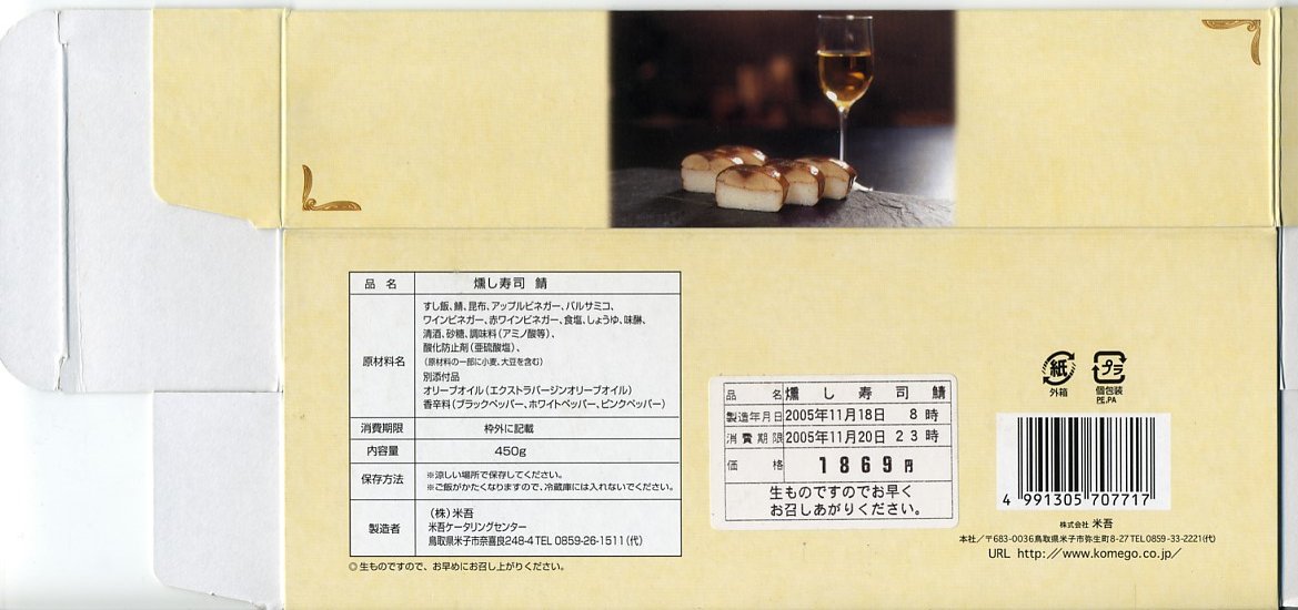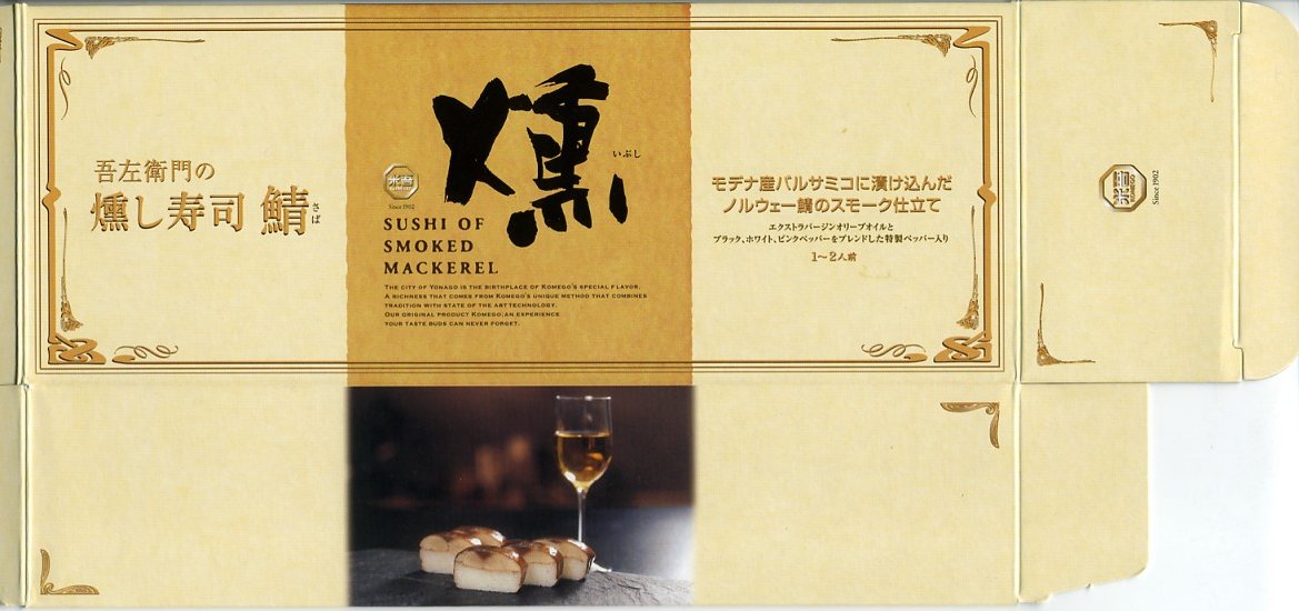 2005(平成17)年の発売か。棒寿司1本をラップで巻いて、袋詰めして箱詰めする姿は、米子駅弁の吾左衛門鮓シリーズと同じ。これは「ノルウェー鯖のスモーク仕立て」ということで、果実酢も使う酢飯と燻したサバを使い、エクストラバージンオイルとペッパー別添して、洋風あるいは今風の香りを楽しませるように作られている。価格は2005年時点で1,869円、2015年時点で2,000円、2019年9月から2,100円。