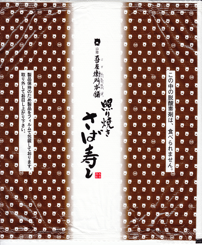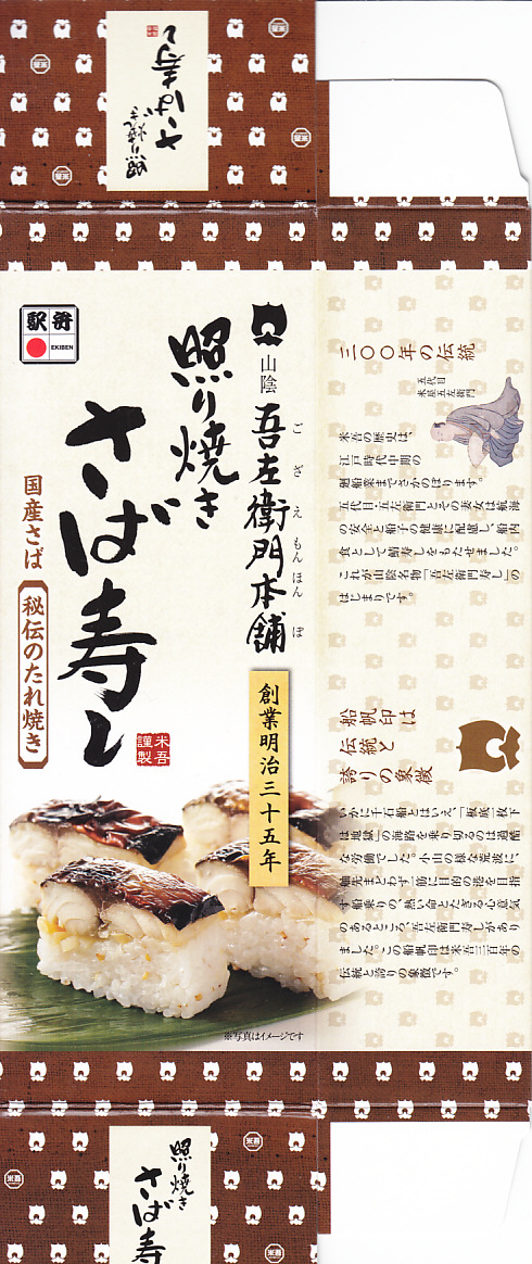 下記の過去のものによらず、2021(令和3)年に米子駅や催事などで発売か。その名のとおり、米子駅弁の吾左衛門鮓シリーズの、1人前バージョン「吾左衛門本舗」の、照り焼き鯖のもの。体裁は他のものと同じく、棒寿司をラップで巻いてトレーに収め、袋詰めしてから紙箱に収めるもの。これは白ごまを混ぜた酢飯に、甘酢生姜を挟んで焼き鯖を貼り、包んだラップごと8切れにカットしていた。