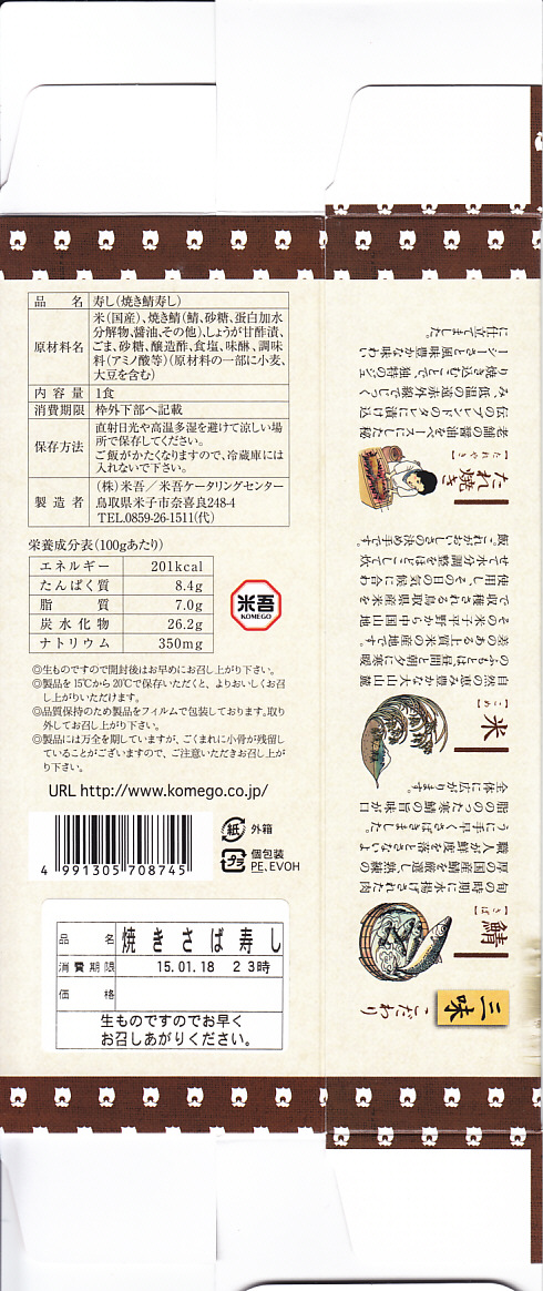 2015(平成27)年1月17日に購入した、米子駅弁のパッケージ。箱の中身と包装が同じなので、2年後の上記の駅弁「吾左衛門本舗 鯖」と同じものだと思う。紙箱の絵柄と、そこに書かれる駅弁の名前が、微妙に異なる。