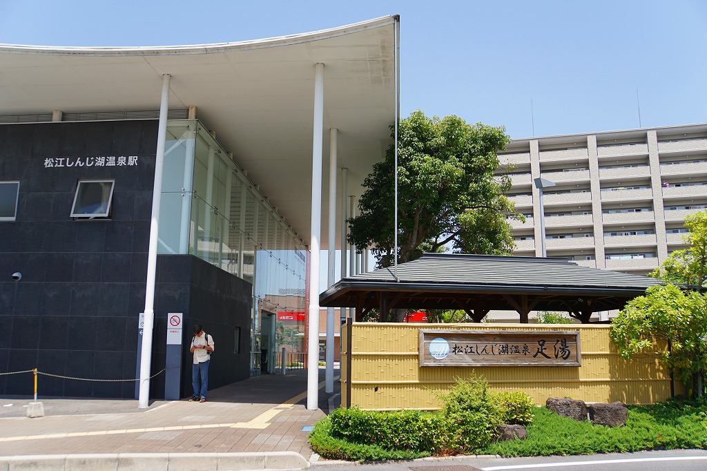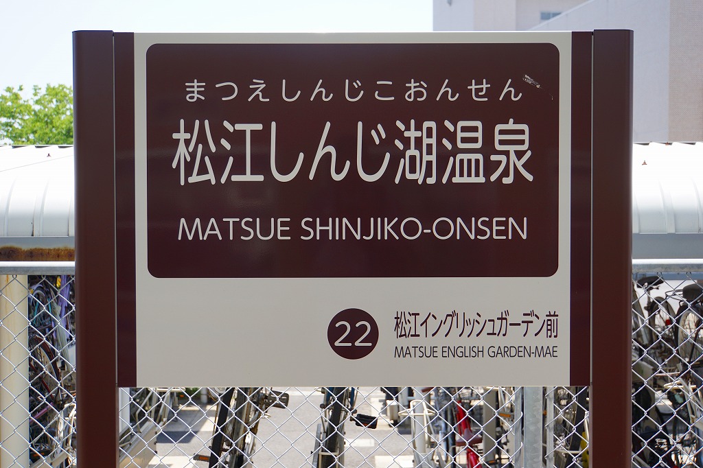 松江の城下町の南側で宍道湖に面する、一畑電車の終着駅。山陰地方で唯一の私鉄線が、松江と平田と出雲市と出雲大社を結ぶ。2014(平成26)年4月に駅弁を発売したほか、台湾の駅弁大会に毎年出展するが、駅で買える弁当はない模様。1928(昭和3)年4月5日開業、島根県松江市中原町。