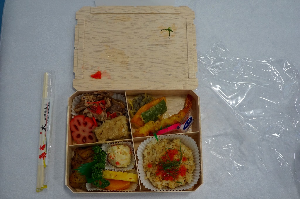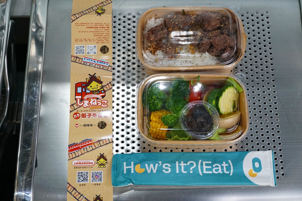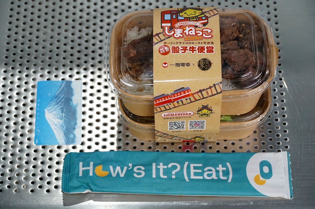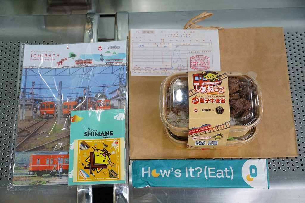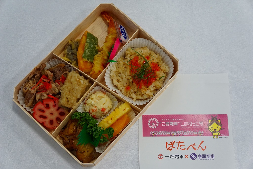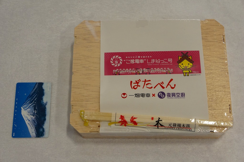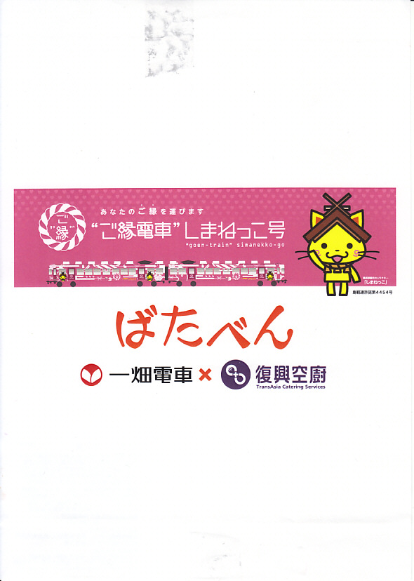 一畑電車の駅弁の掛紙には、島根県のゆるキャラ「しまねっこ」、一畑電車のイラストと社名、今回の弁当の調製元である復興空廚の社名を印刷した。四角く平たく駅弁らしい形をした木製エコ容器を4つに仕切り、それぞれにイクラを載せたチャーハン、エビやカボチャなどの天ぷら、魚の南蛮漬と牛肉煮、鶏肉とポテトとフルーツを詰めた。いずれも味は日本風、食感はべちゃっと台湾風。この「駅弁」は、出雲の地で売られることはあるのだろうか。