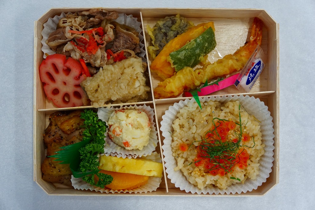ボール紙の箱に茶碗風の絵柄を持つプラ製トレーを収める、市販の惣菜弁当向け容器の9区画の中身は、白御飯、ちらし寿司、シジミ御飯、鶏唐揚、マイタケとエビの天ぷら、牛肉煮、あらめ炒め物、玉子焼とあご焼き(ちくわ)、小松菜和え。