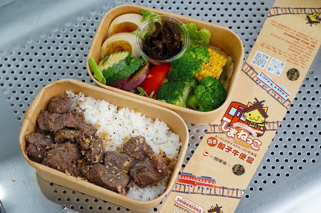 台湾の駅弁大会「鐵路便當節」の、2025年6月の台北駅での第10回開催で、一畑電車の駅弁として販売されていたお弁当。この大会に毎年出店する一畑電車では今回、この弁当のみを販売し、観光チラシを配っていた。厚紙製の弁当箱をふたつ重ね、オレンジ色の電車と島根県の観光キャラクター「しまねっこ」を描いた、黄色い掛紙を巻く。品名は掛紙に「ガーリックサイコロロースト牛弁当」とあり、繁体字表記もだいたいそんな意味。