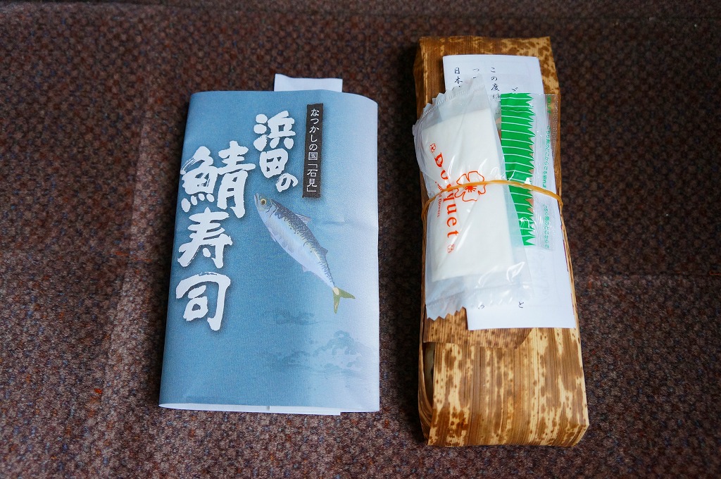 浜田駅の「市民サロン」なる、観光案内所兼特産品販売所兼待合室兼市役所窓口で売られていた商品のひとつ。訪問時には「柿酢のどぐろ鮨」「さくら鯛笹寿し」「小鯵寿し」「のどぐろ寿し」「浜田の鯖寿司」が、駅弁のような姿をして、売店正面の台に並んでいた。