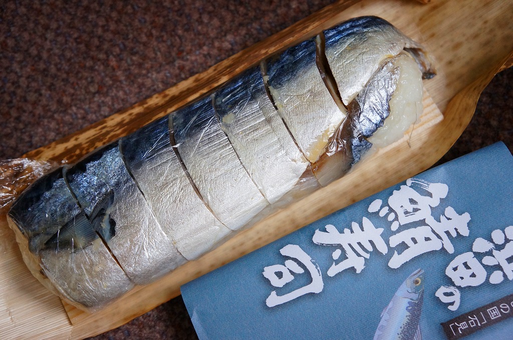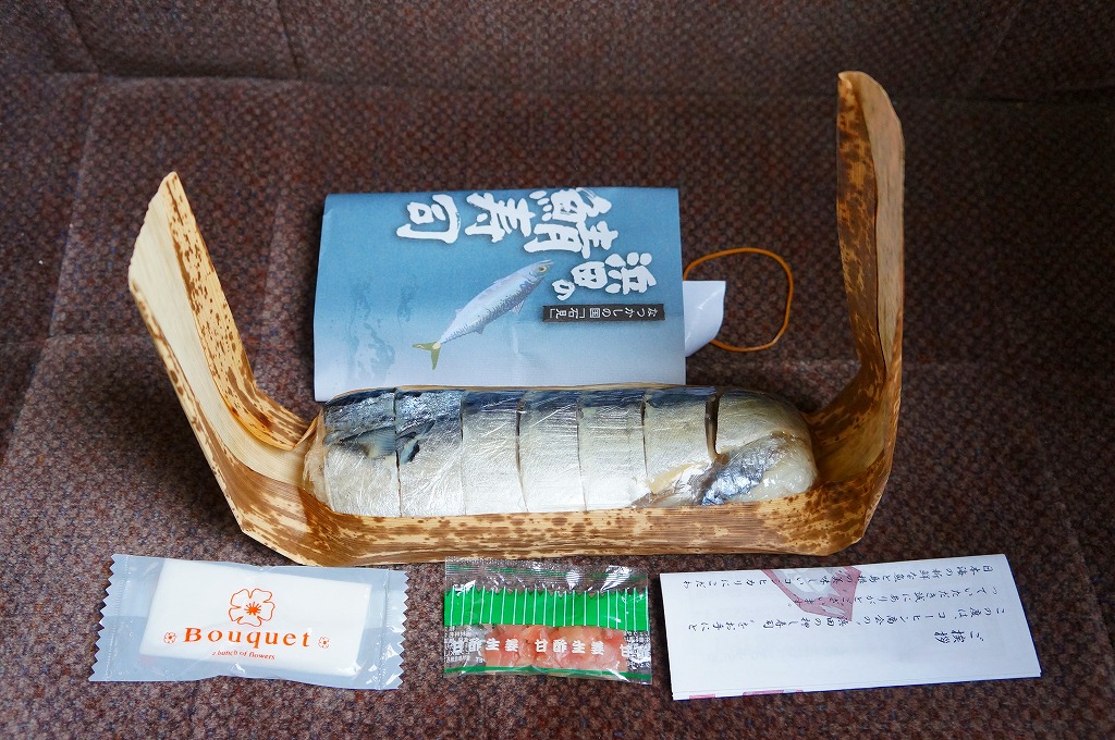 尾ヒレが付いた、焼かないタイプのサバの棒寿司が1本、ラップを巻いてカットされ、板に載せて竹皮で包まれ、商品名などを書いた掛紙を巻かれる。駅弁のサバ棒寿司としては手作り感のあるお惣菜で、石見の国で名物とされるサバ1本を使ったサバ寿司の片鱗が見える気がする。調製元は浜田市内の弁当屋さん。