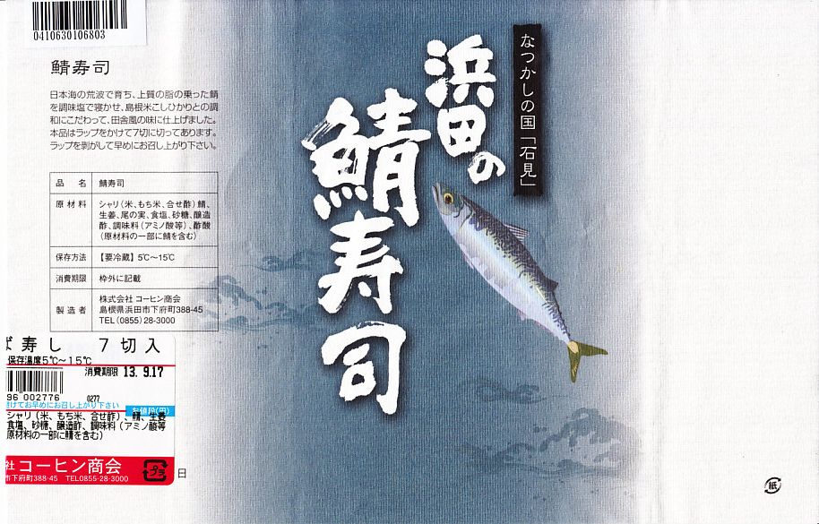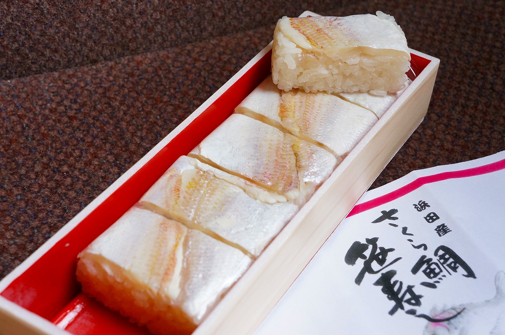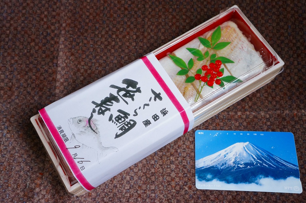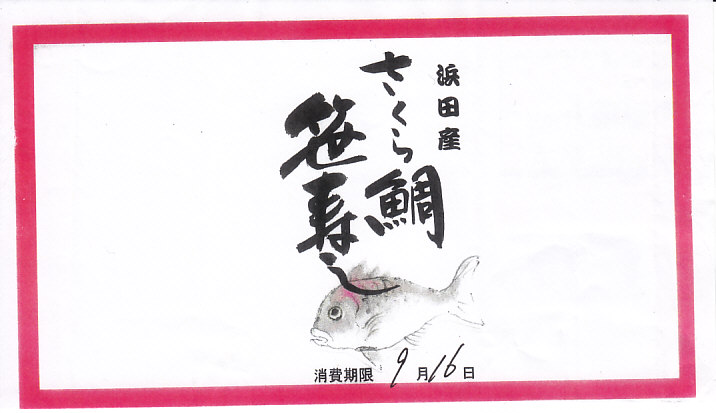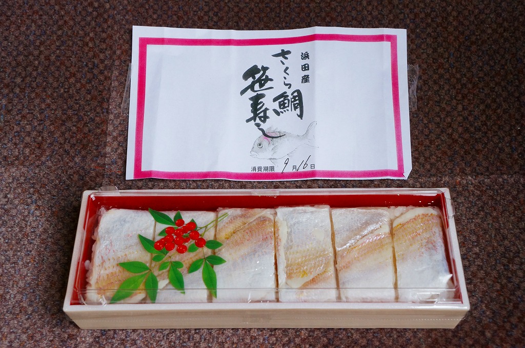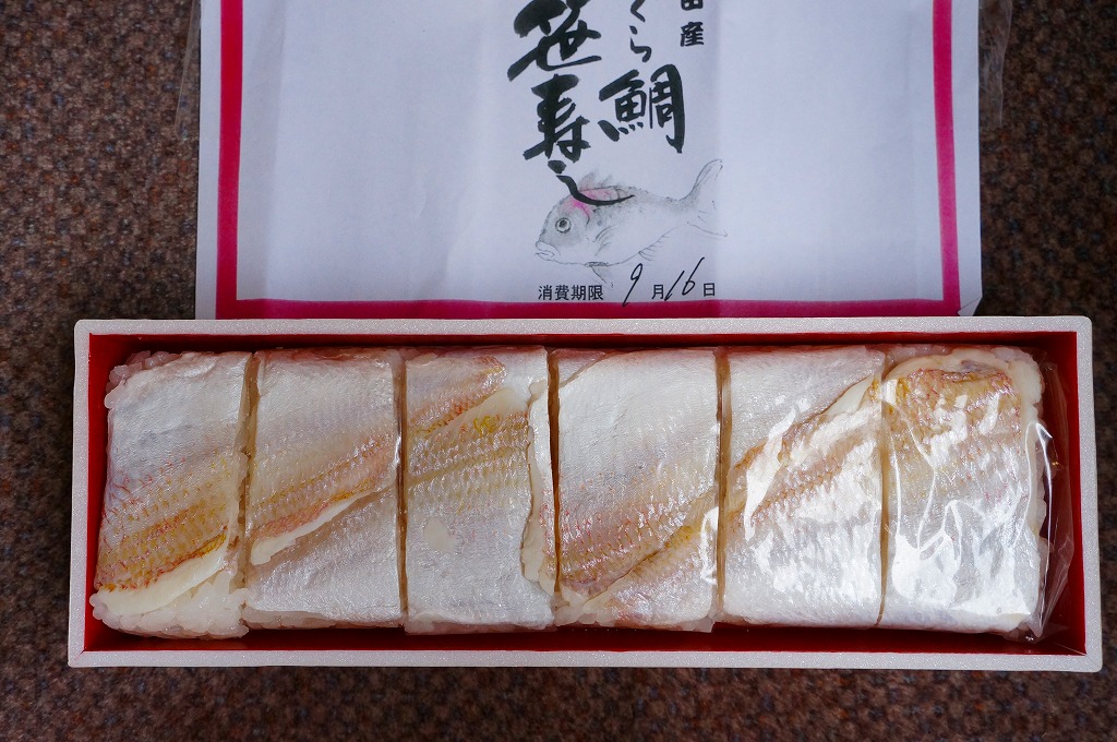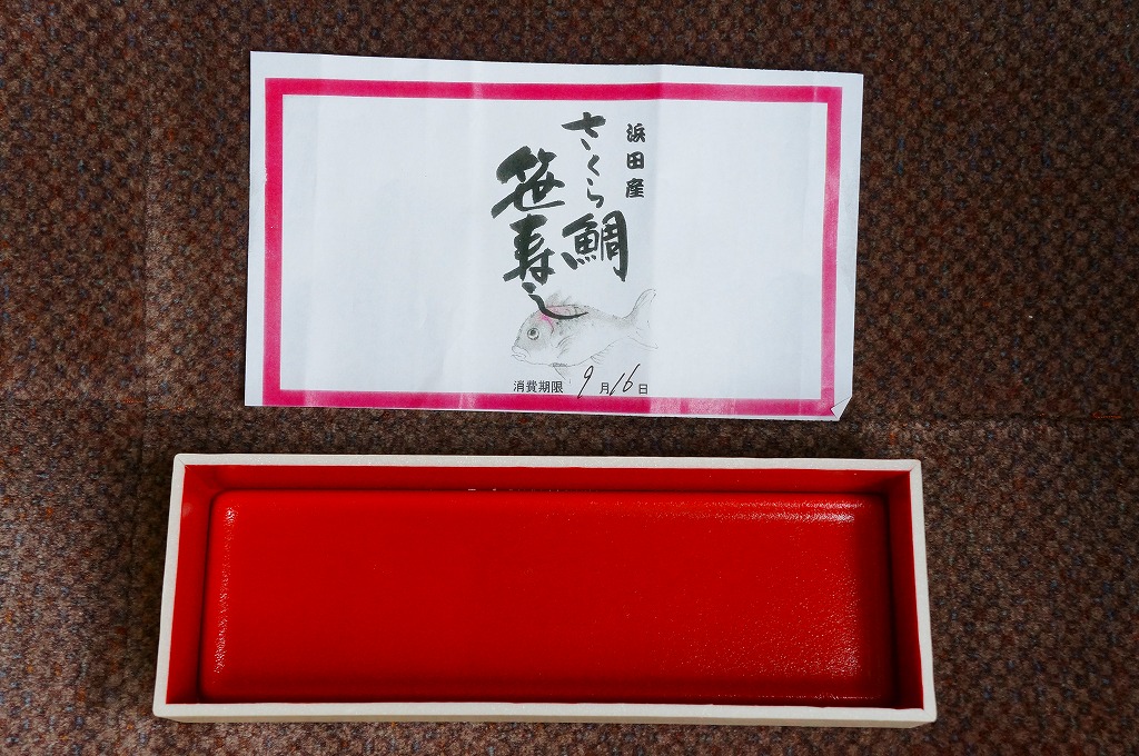 浜田駅の「市民サロン」なる、観光案内所兼特産品販売所兼待合室兼市役所窓口で売られていた商品のひとつ。酢飯に浜田産というレンコダイを合わせた、棒寿司タイプの押寿司を1本、ラップを巻いて6切れにカットして、細長い箱に詰める。ガリも醤油も付けないシンプルな内容で、味を感じないほどの淡泊さと、サクラ色のきれいな見栄えと、手作り感のある掛紙が特徴。調製元は浜田漁港の水産加工業者。