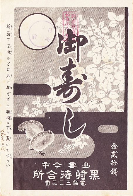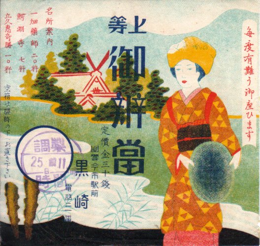 第二次大戦前の調製と思われる、昔の出雲今市駅、現在の出雲市駅の駅弁の掛紙。収集者は1938(昭和13)年6月4日の調製とみなし、掛紙にそう記した。調製印は日と時のみを示し、絵柄に名所その他の情報が何もなく、いつのものかは分からない。